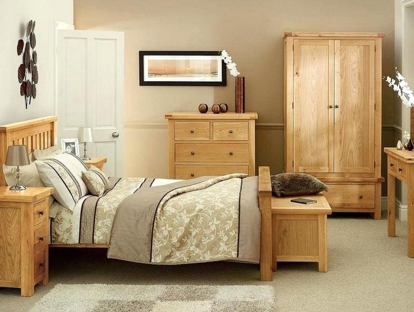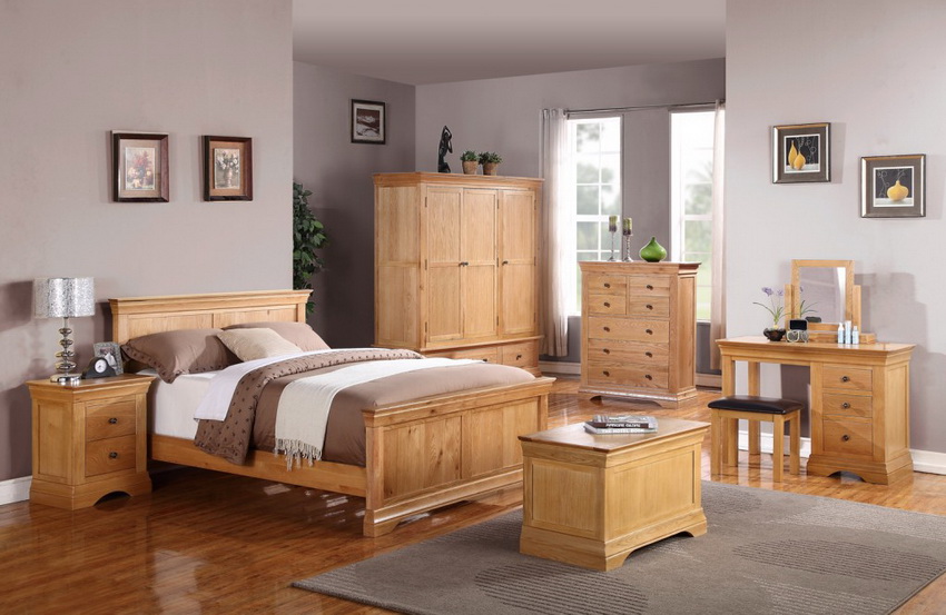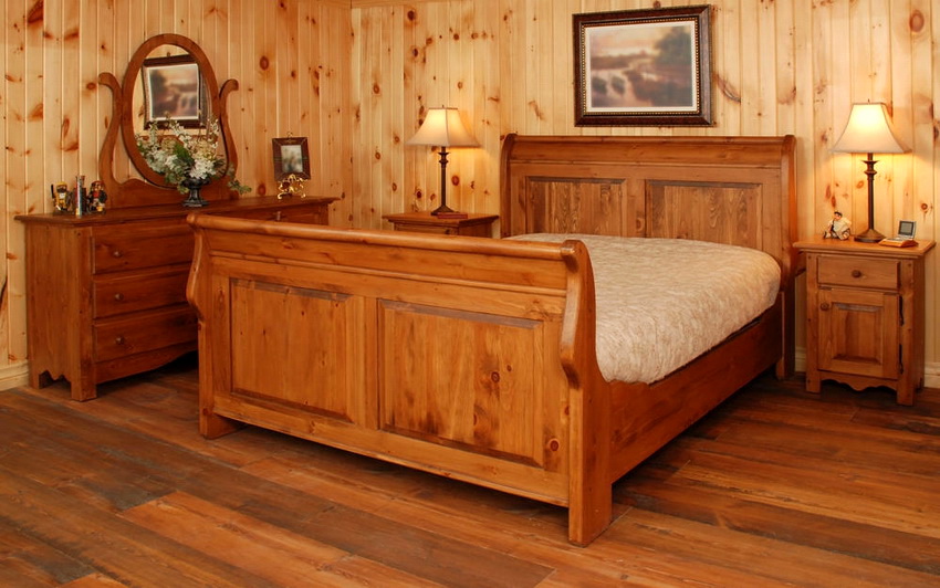 Pine, maple, linden, cherry, oak wood is most often used as raw material. The most expensive, but at the same time durable and prestigious are oak and cherry products. Pine is more affordable in terms of price. Solid wood sleeping sets always look, if not bulky, then solid. This must be taken into account when choosing a complete set, having previously compared the dimensions of the furniture with the dimensions of the bedroom.