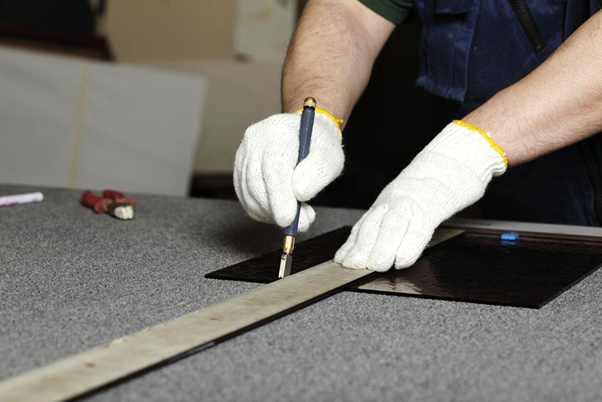 First of all, on a sheet of glass, you need to mark the cut line with a marker, put a ruler (it will also serve as a stop), use a glass cutter to draw a smooth line with a confident movement. Then move the workpiece to the edge of the surface and by pressing break the glass along the cut line.