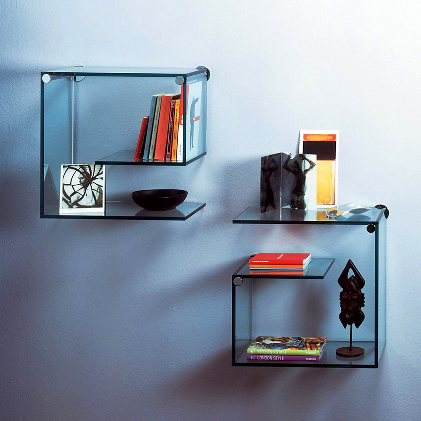 Dark glass will be expressive on matte, pastel walls. Colored glass on the wall of the same shade can become a creative design solution. The apparent "suspension" of objects placed on such shelves visually frees up space. Dark objects with clear outlines, located on transparent shelves against a light background of walls, also have the effect of weightlessness.