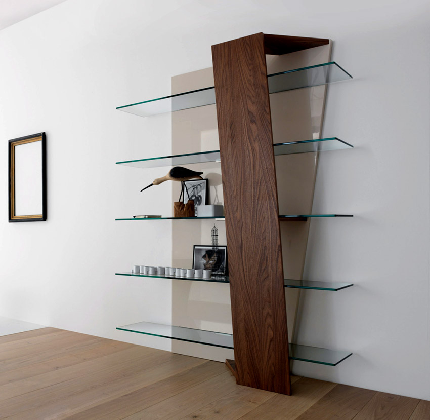 The shelf looks much more interesting if the books are arranged vertically on it. Stacked in piles, they evoke the feeling of a temporary stay. Therefore, it is necessary to provide a structure that allows the books to be in a stable position. Photos of glass book shelves posted on the Internet offer several solutions to this problem. The shelf is complemented by a small edge on one side, which becomes a support for books. Glass bending also gives great opportunities. The structure can have a curved shape with smooth flat surfaces, on which, due to the bulges, the stable position of the books will be ensured.