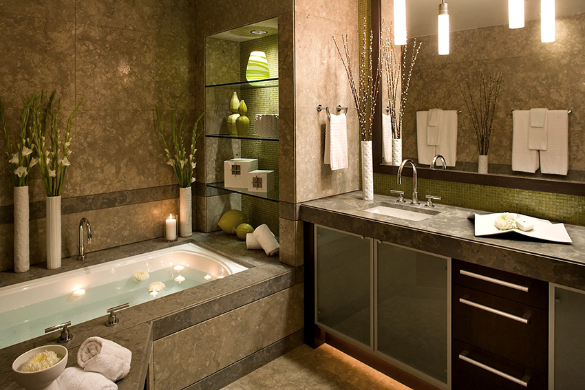 It is almost impossible to avoid high humidity and water ingress on the bathroom surfaces. It is for this reason that glass is used as a material for decorating a bathroom: it does not warp, does not lose its aesthetics, and does not absorb moisture. Therefore, wiping is sufficient to dry the surface.