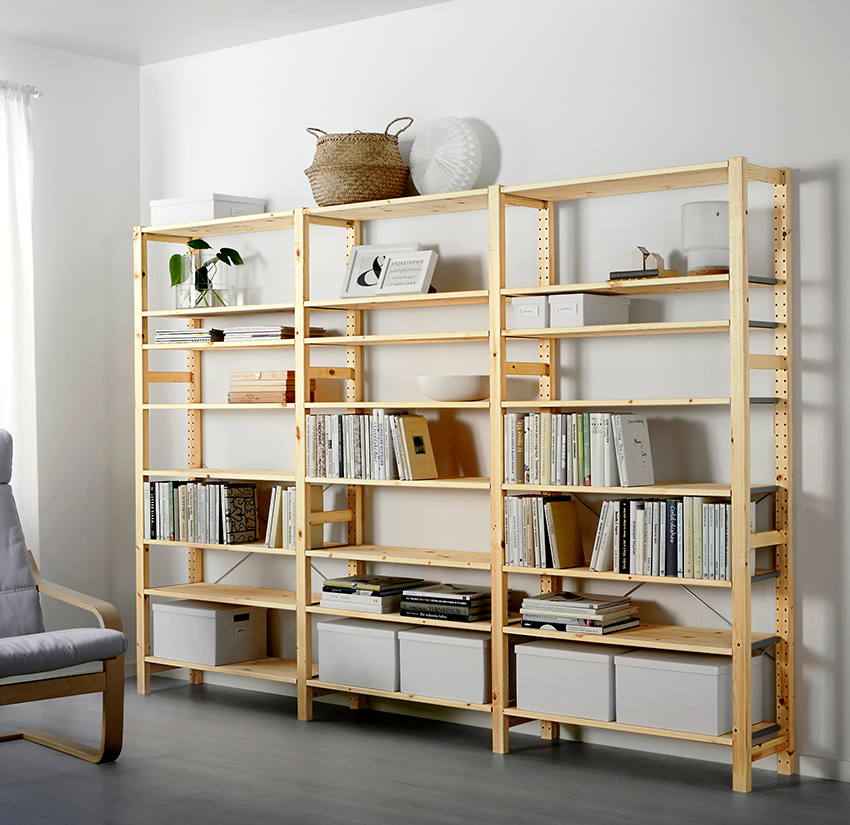 IKEA book shelves have both classic designs and quite original ones, with an unusual arrangement and an interesting shape of vertical bases and transverse elements. Most of the furniture is made of wood, which favorably emphasizes the environmental friendliness and durability of the products. There are models with preserved natural wood structure, as well as painted in a variety of color options.