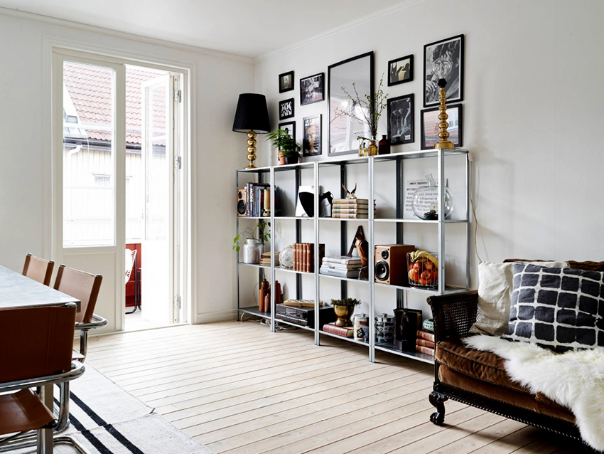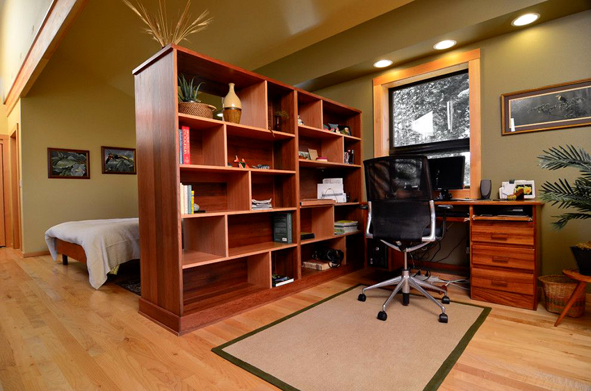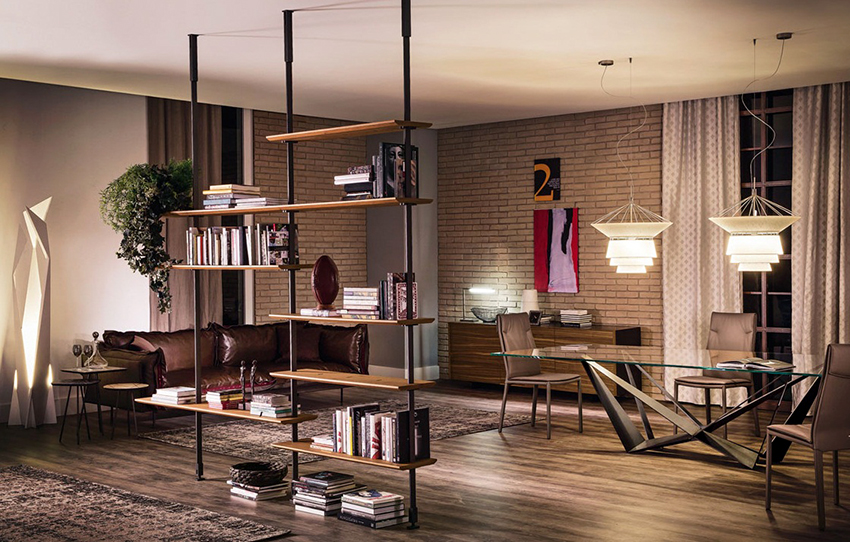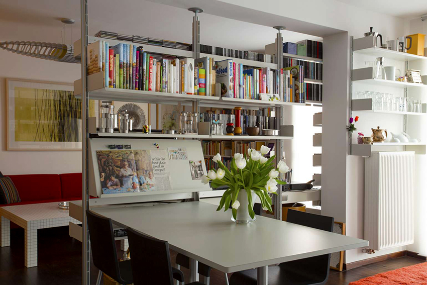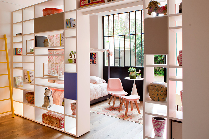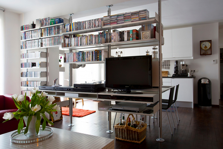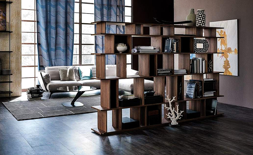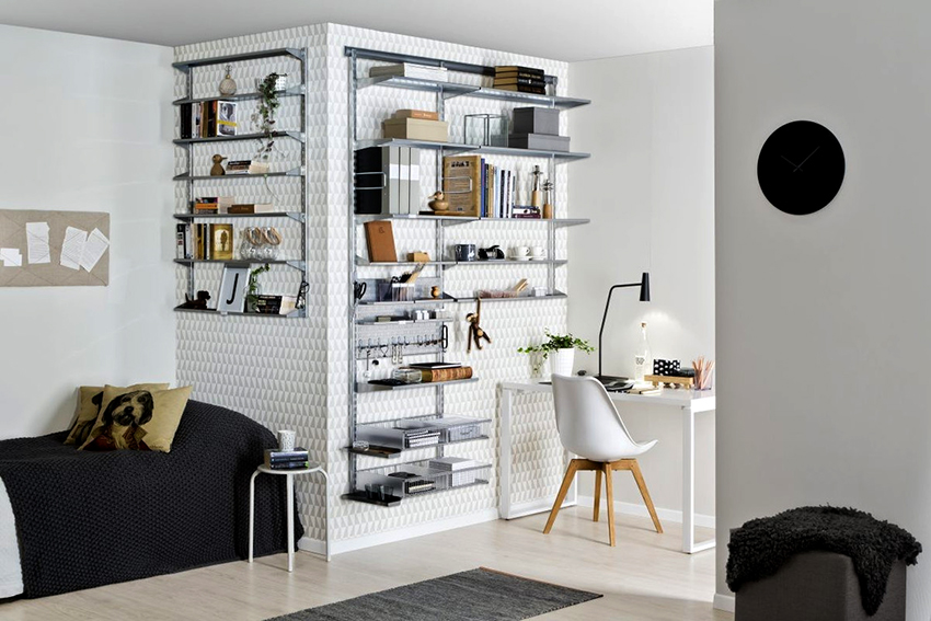 Dividing and zoning a room with a rack have almost the same goals, but still a certain difference can be distinguished: zoning is less cardinal, more visual and symbolic. Consequently, the requirements for shelving structures are significantly reduced: almost any model (if it matches the style of the room's decoration) can be used to achieve the result.