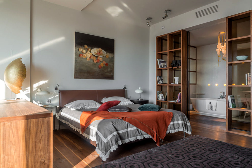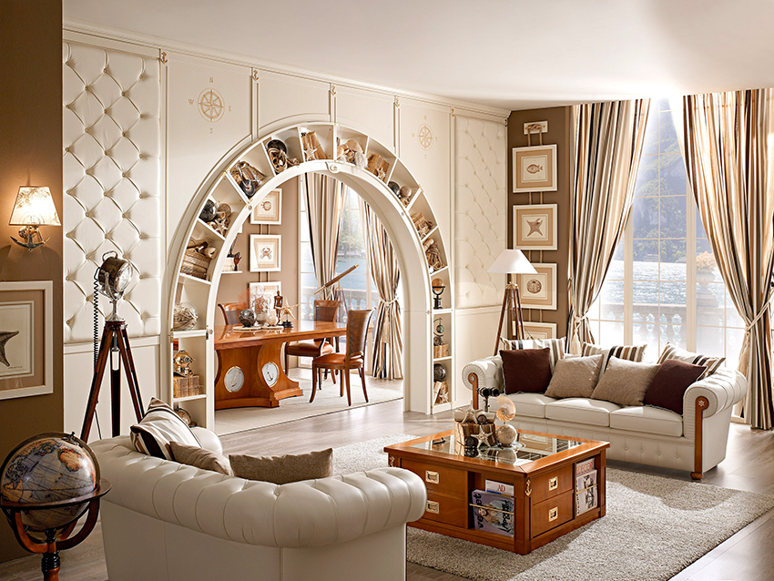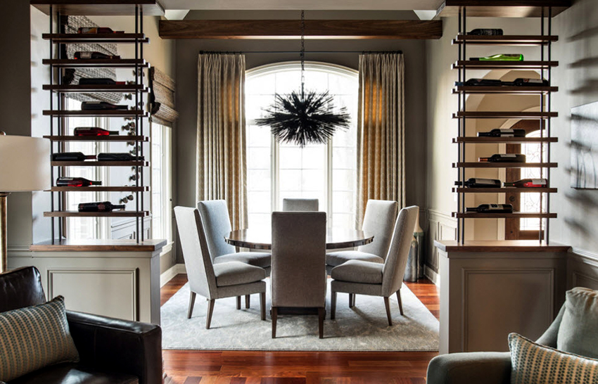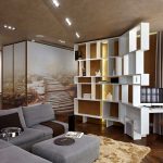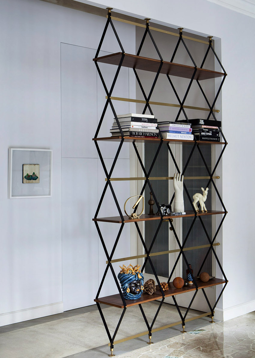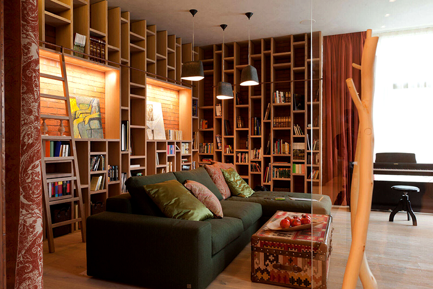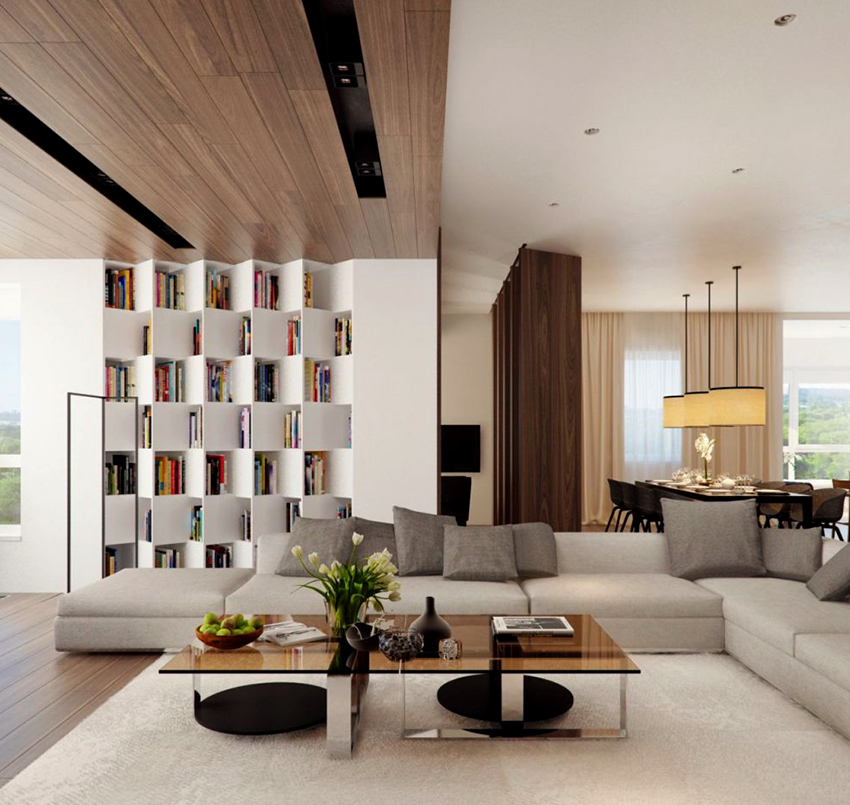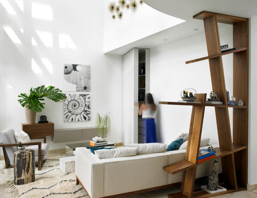 Interesting are the structures from floor to ceiling, equipped with a small number of shallow shelves. Decorativeness and separation of premises are their main function.