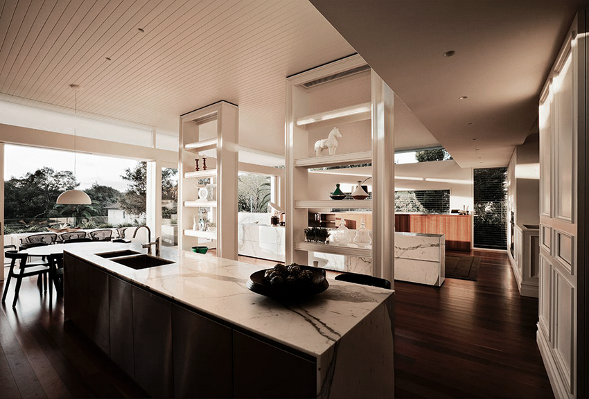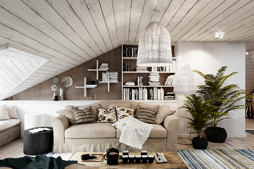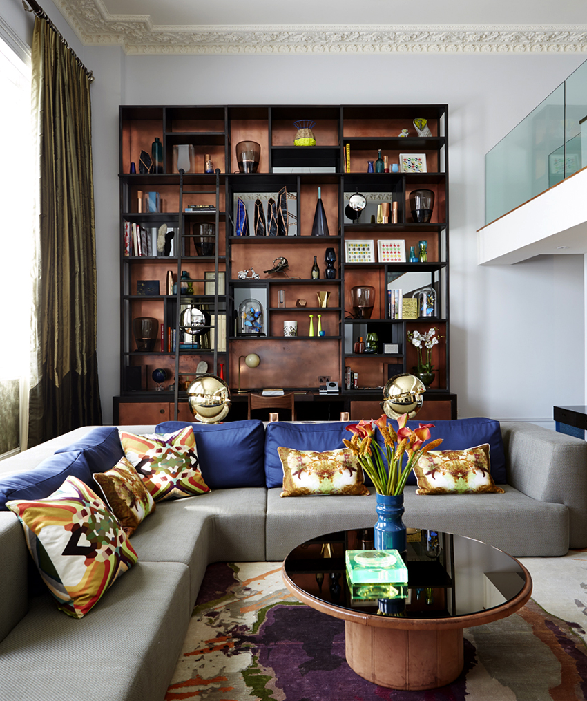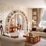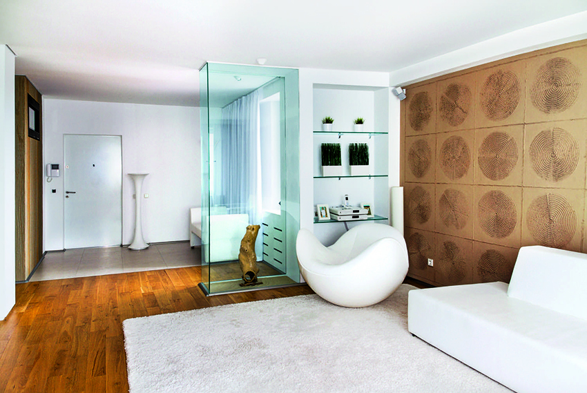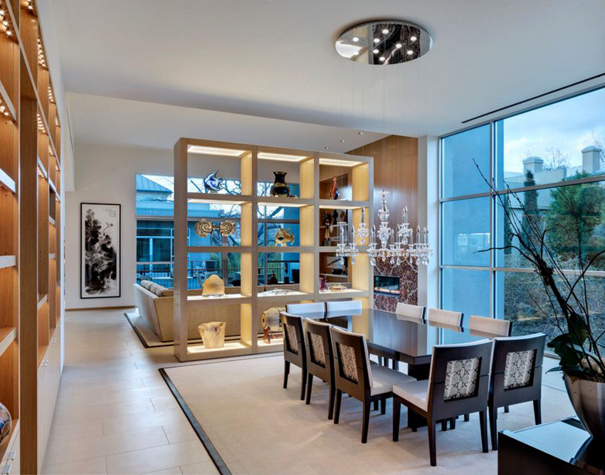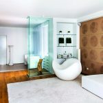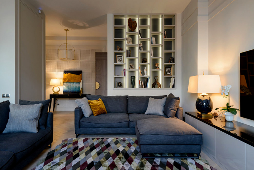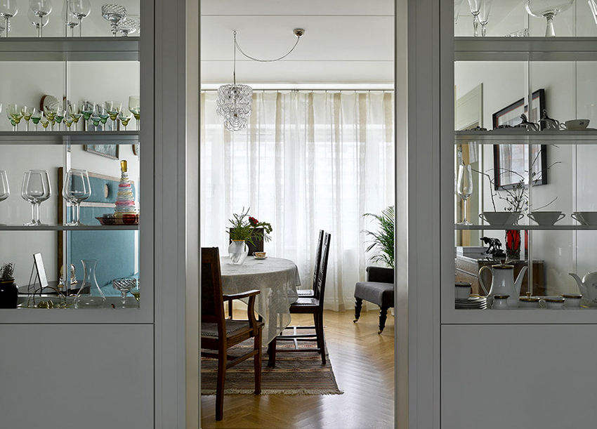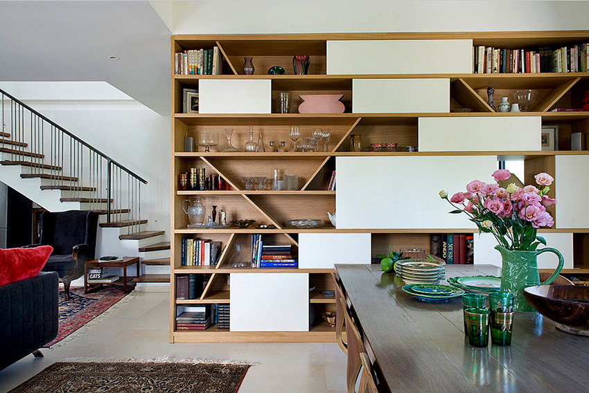 Interesting are the structures from floor to ceiling, equipped with a small number of shallow shelves. Decorativeness and separation of premises are their main function.