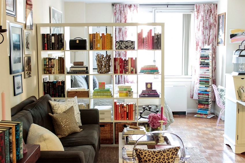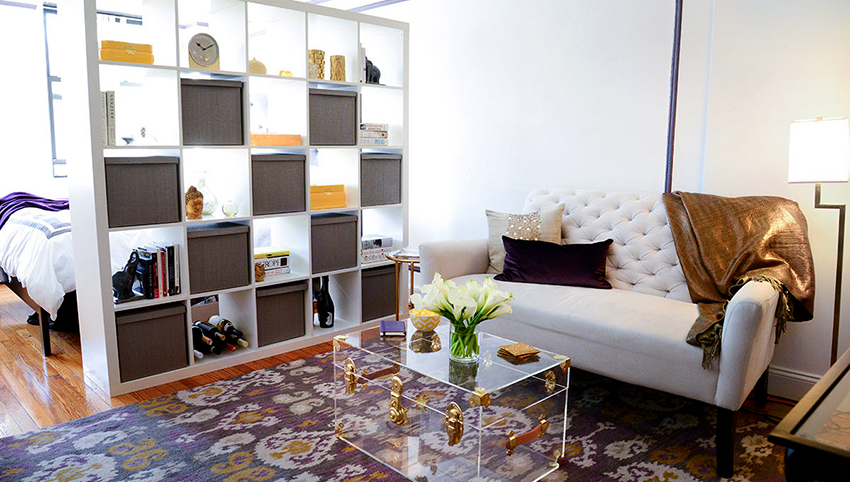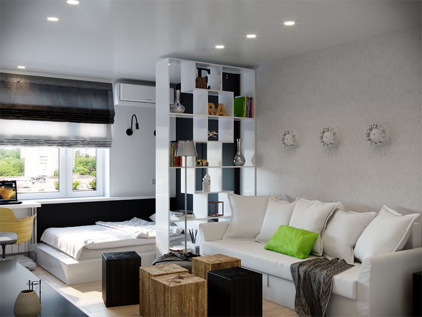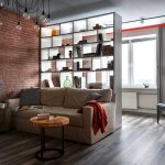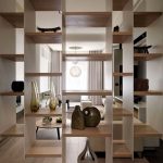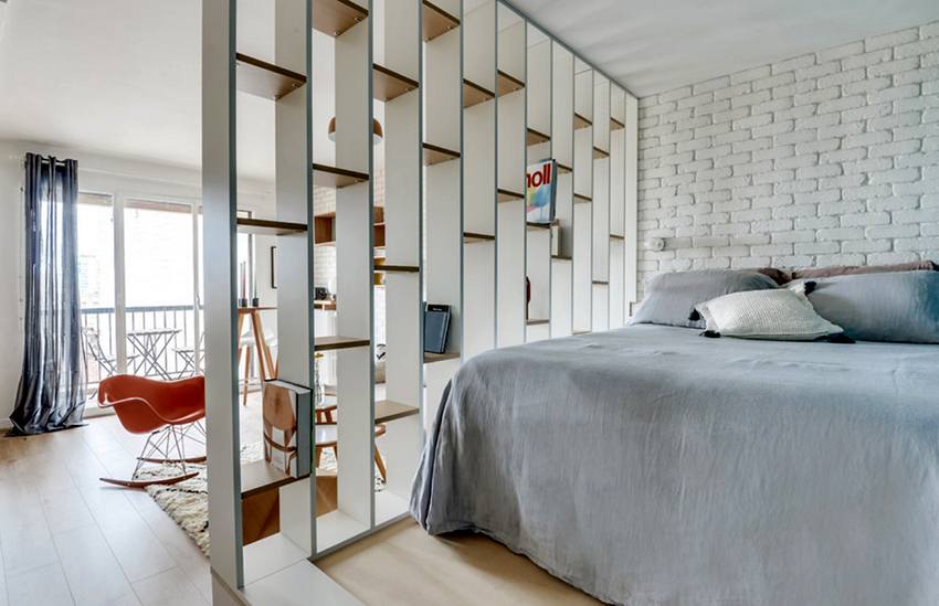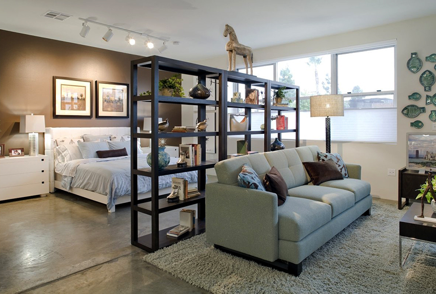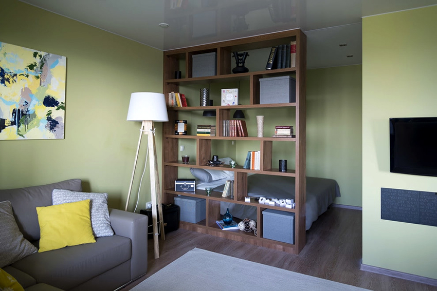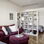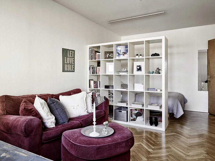 If a rack-partition is used to divide a small room, it is better to purchase a structure with a height of 100-120 cm. It will divide the area of the room, but retain the feeling of free space. Tall models will crush the room. The dividing structure should not stand out from the general interior style and attract special attention to itself.