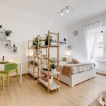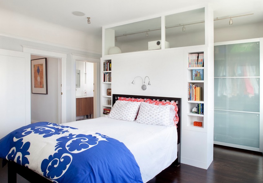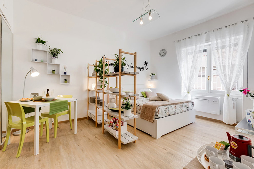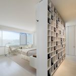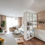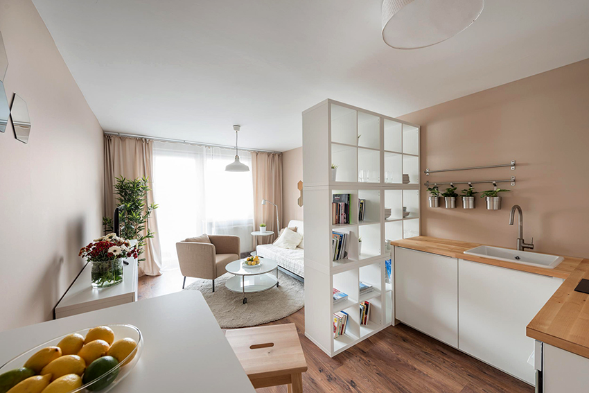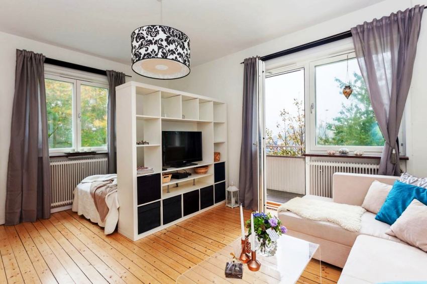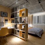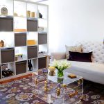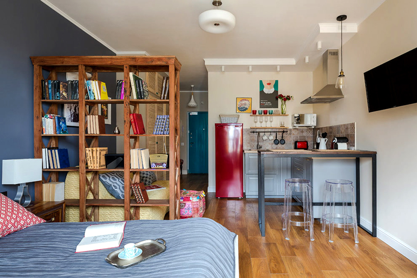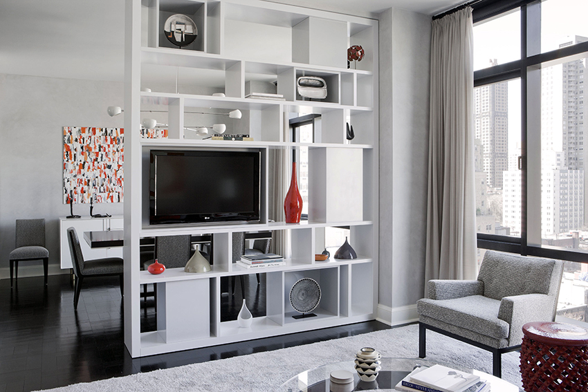 If a rack-partition is used to divide a small room, it is better to purchase a structure with a height of 100-120 cm. It will divide the area of the room, but retain the feeling of free space. Tall models will crush the room. The dividing structure should not stand out from the general interior style and attract special attention to itself.