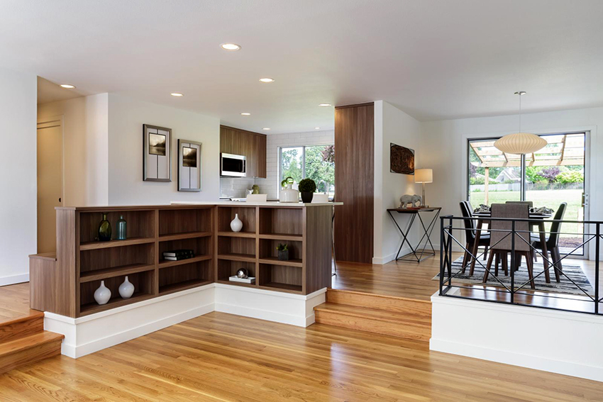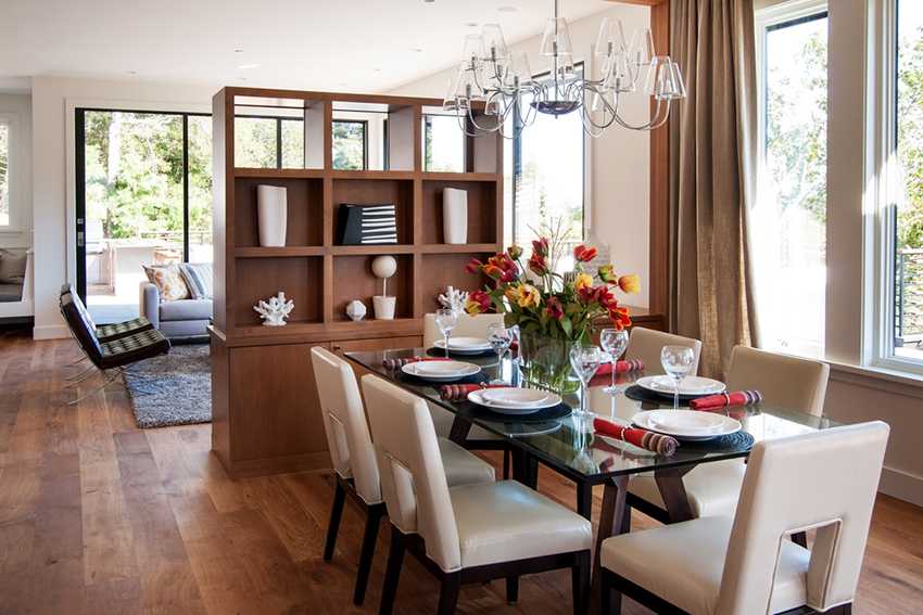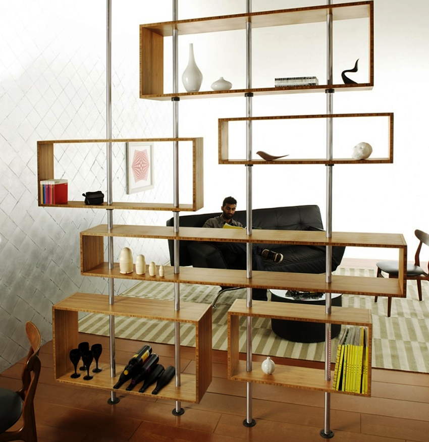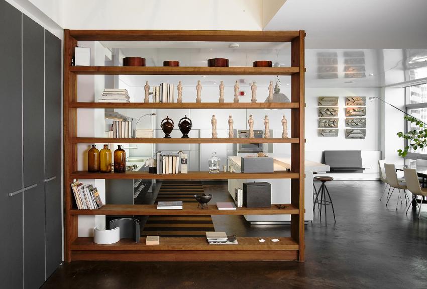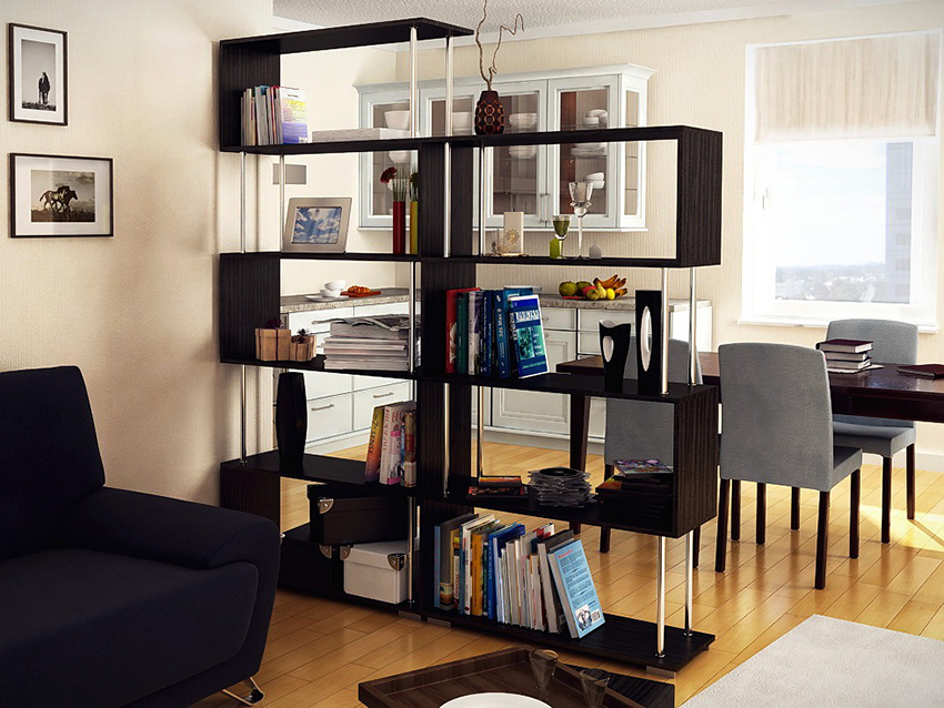 Shelving - multifunctional furniture. One of its purposes may be room zoning. This technique is now used quite often when decorating a home. A rack for dividing a room allows you to deliberately delimit the area without splitting the house (or apartment) into rooms, creating the feeling of a large amount of free space.