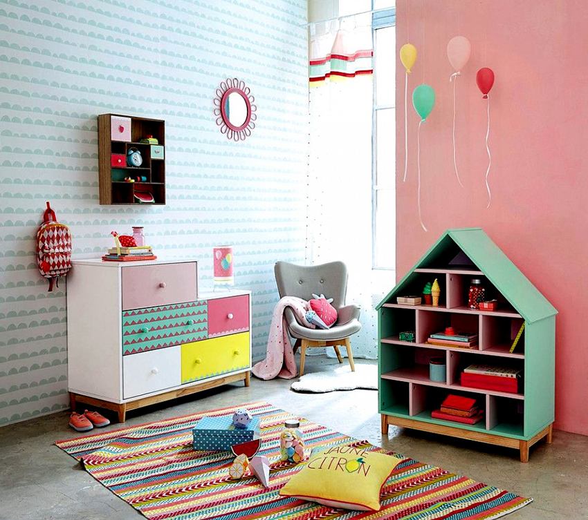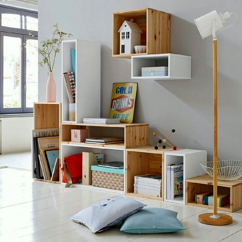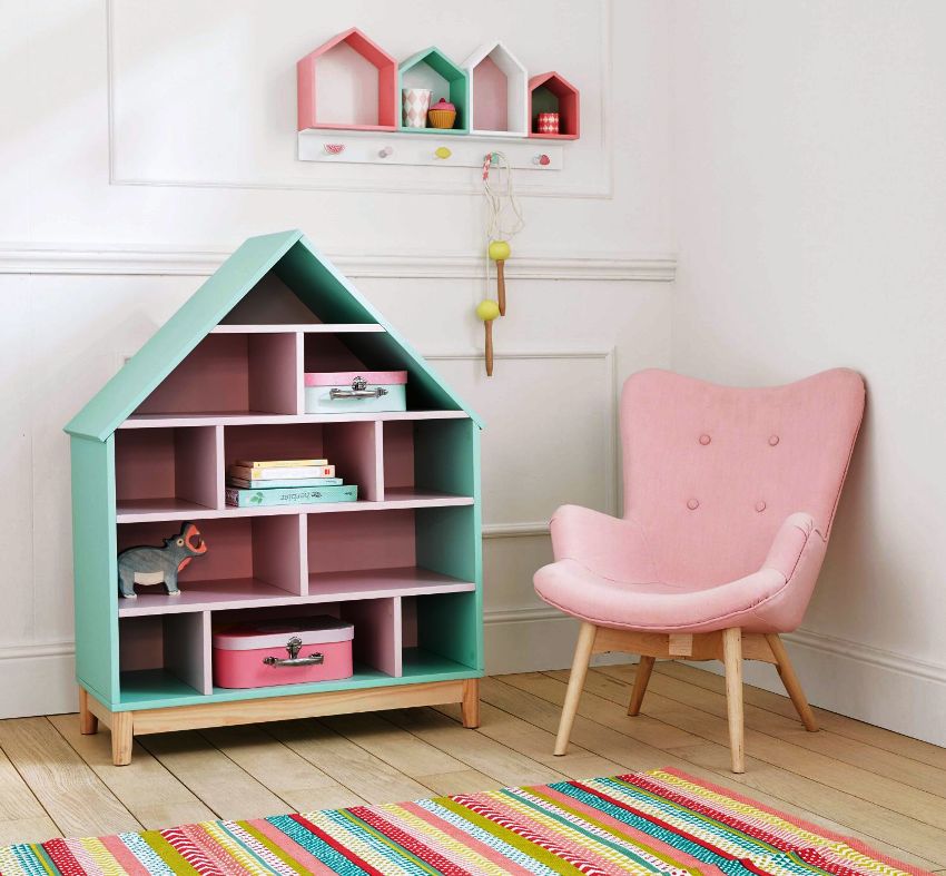 A fairly common model is cubes, "folded" in various ways: in the form of a slide, a house, a triangle, a square, a rectangle. The different colors of the shelves enhance the resemblance to the children's construction set, which contributes to the creation of a special atmosphere in the room. It will be very convenient to use this rack to divide the room into zones: you will get a place for games, where activity, violent positive emotions will reign, and a sleeping area with a calming, pacifying atmosphere.