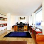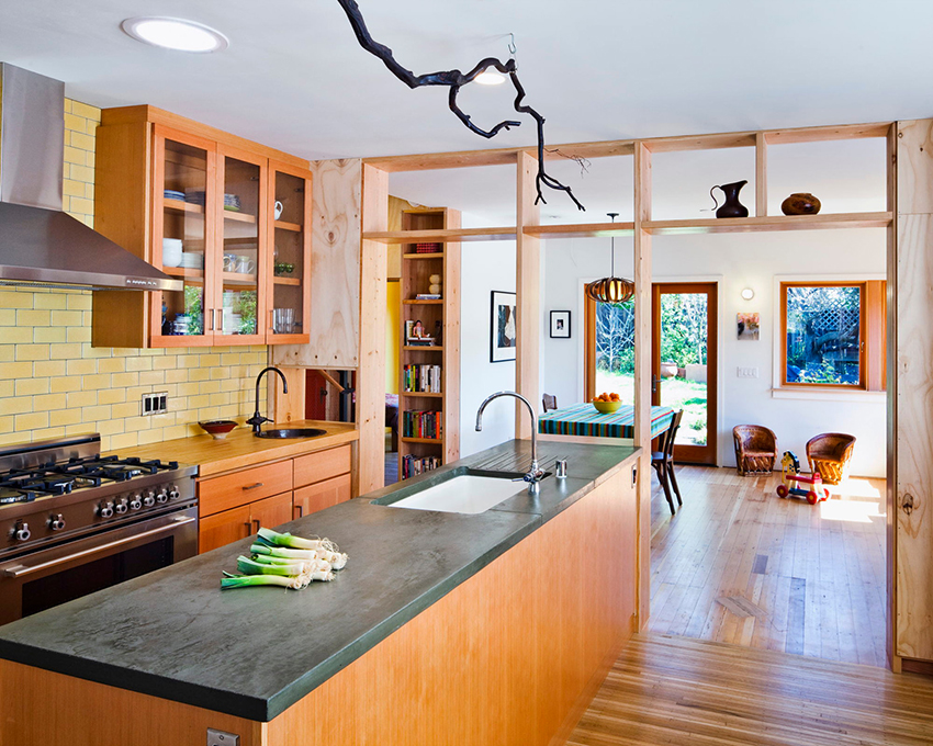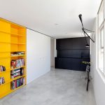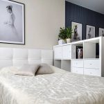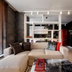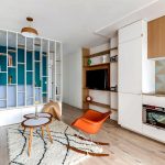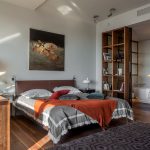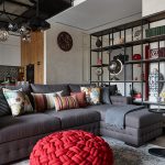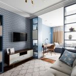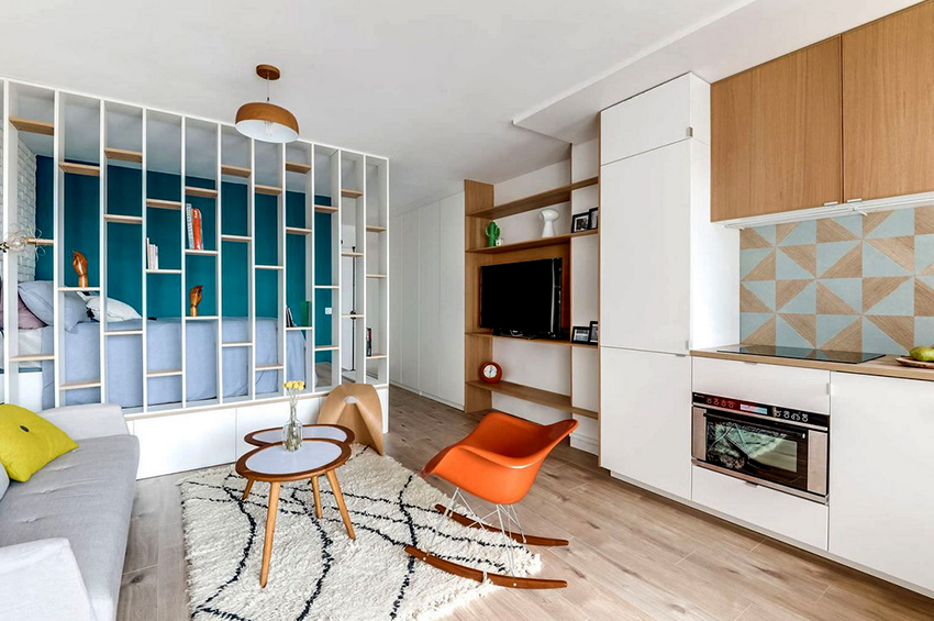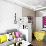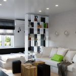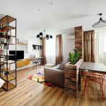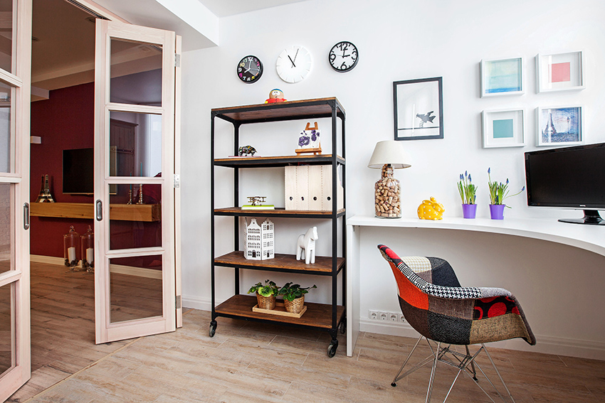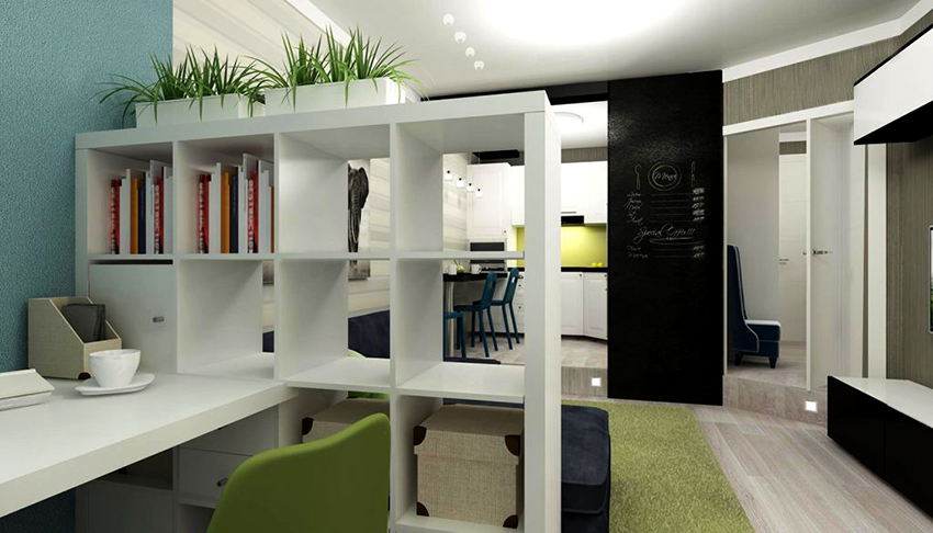 The 80 cm high zoning rack, consisting of two shelves, perfectly separates the seating area in the office by the window. A structure of metal pipes located perpendicular to the wall with a small number of plywood shelves will delimit the dressing and undressing area near the hanger and an open bedside table for bags, a key house, a magazine rack and a basket for umbrellas in the hallway, which make up a single design composition.