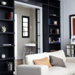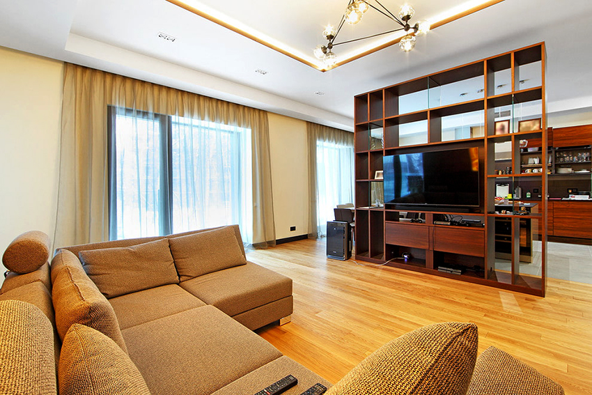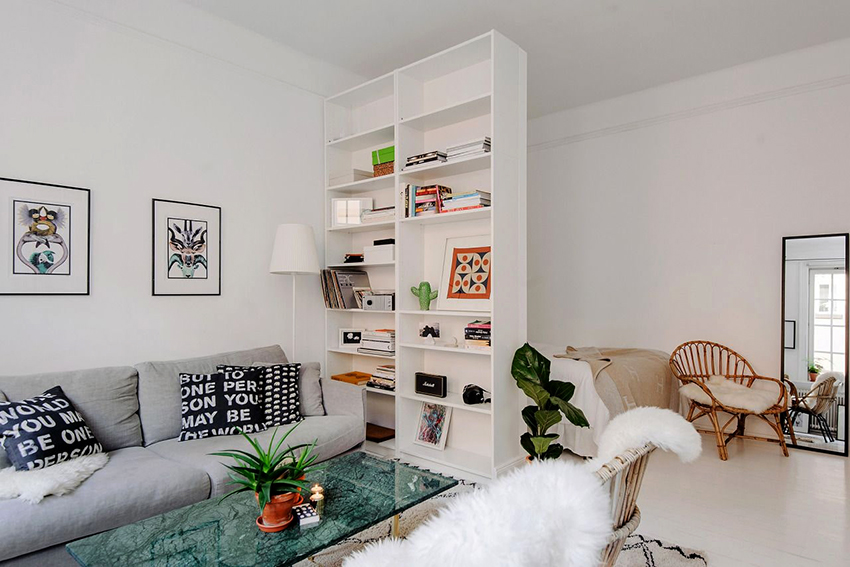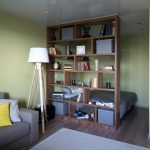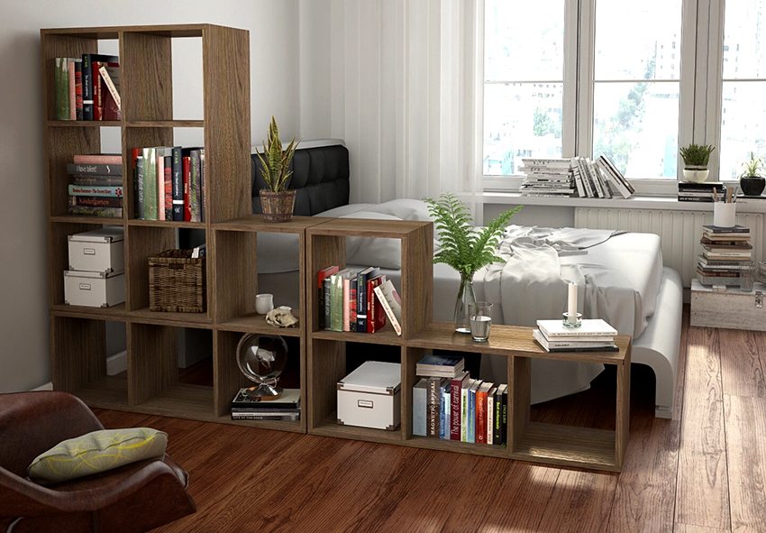 The furniture industry offers many options for using the shelving for this purpose. These are quite voluminous structures. Sometimes they are installed permanently, as they have a considerable height. Many people prefer to use products with a back wall to partition off rooms, which provides some degree of isolation.