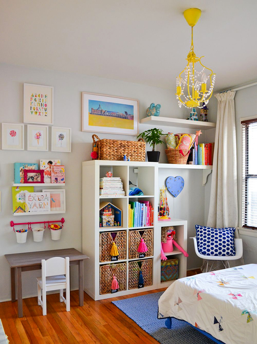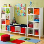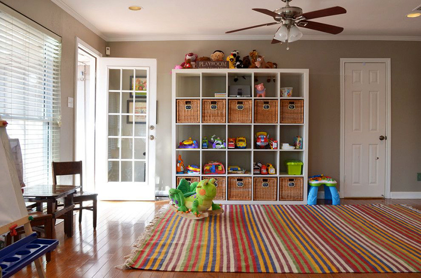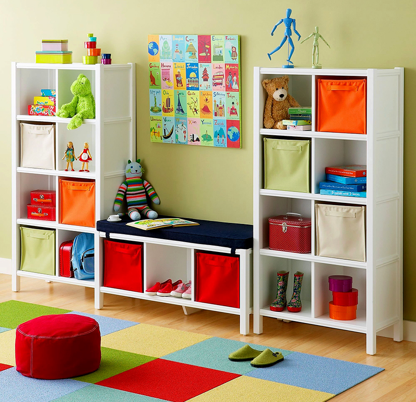 A rack with light plastic containers on the shelves will also be convenient for storing toys. It is convenient to store small parts and toys in them.