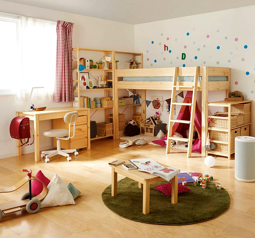IKEA racks for children's rooms are especially popular. Designs with plastic containers look aesthetically pleasing and child-friendly. The line is represented by models that imitate fairy houses and other solid wood options for teenage children.