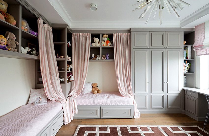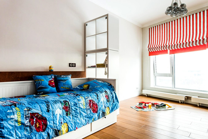 Modern designers offer various models of products for storing books, sports equipment, crafts, photographs.A convenient type of shelving for a child is a design with pull-out containers fixed on the shelves. They can be used to store clothes, stationery and other items that do not look neat when opened, even if they are stacked.