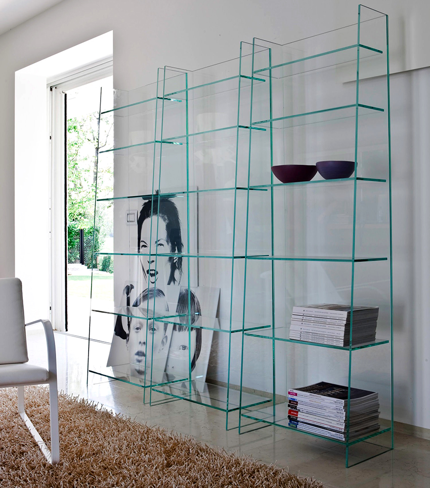 Racks for zoning space in a room can be completely lightweight structures made of glass and plastic supports. This option is appropriate when it is necessary to allocate several areas in the room, for example, recreation areas for all family members.