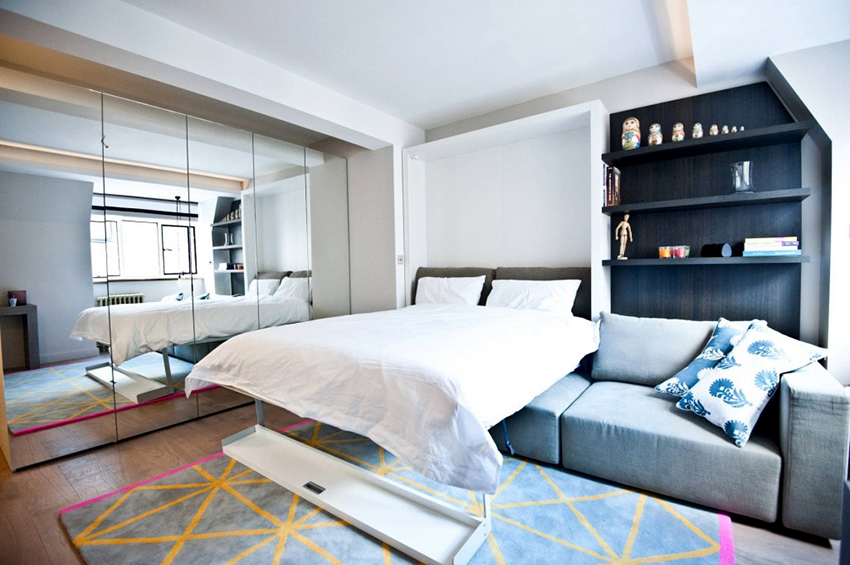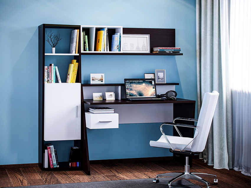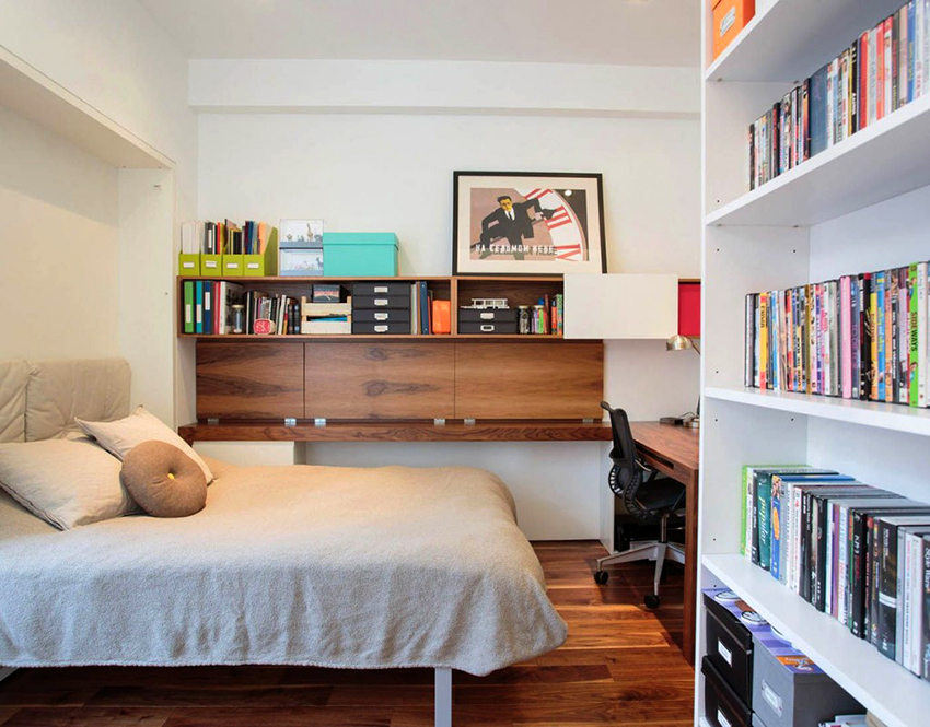 Small rooms, to a greater extent than other rooms, need this type of furniture, such as a shelving, since in its functions it can combine a wardrobe, a bedside table and a table. If the choice is made correctly, this design will visually enlarge the room, otherwise it will reduce it.