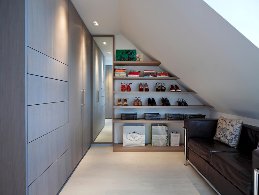 There are also many design suggestions for wood shelving for a wardrobe room. Most often, these are structures with a frame, in which the internal space is divided into various sectors: small shelves for hats and bags, niches for outerwear, pull-out elements for shoes, etc.