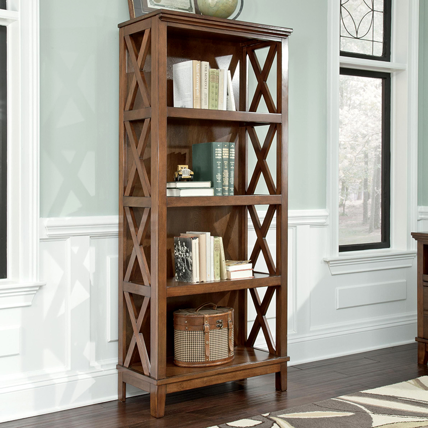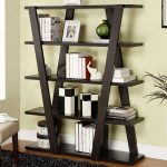 In the photo - wooden book shelves. Artistic processing is done through toning. In addition, the products are distinguished by their original shape and unusual arrangement of structural elements. Inlay is also used for decoration.