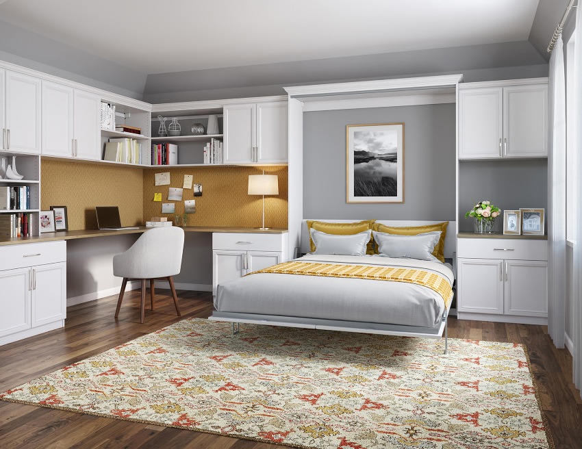 Recently, you can find walls in the bedroom in a modern style, which have a special niche for a folding bed. Such transformers, when unfolded, look like a full-fledged double bed, on the sides of which there are shelves or high cabinets to the ceiling. If the bed is folded down, it either becomes flush with the side cabinets, or has an intermediate position, which forms a small sofa for sitting. This wall option is ideal for a small studio apartment where the bedroom is combined with the living room. However, one must take into account the rather high price, which is formed due to the complex and expensive transformation mechanism.