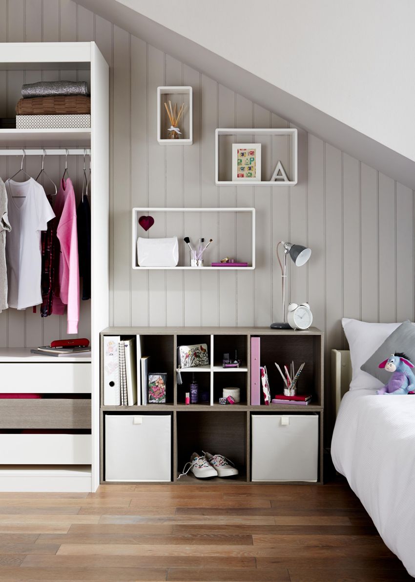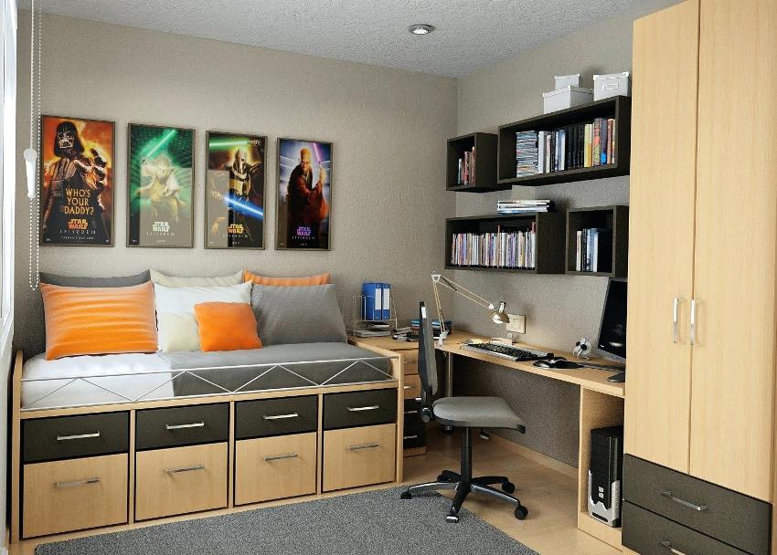 In the teenager's bedroom, instead of a TV, it is better to install a computer, over which it is recommended to place the child's favorite books or educational material. Thus, it will be possible to save additional space and organize the workplace correctly.