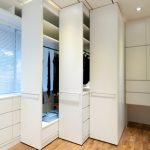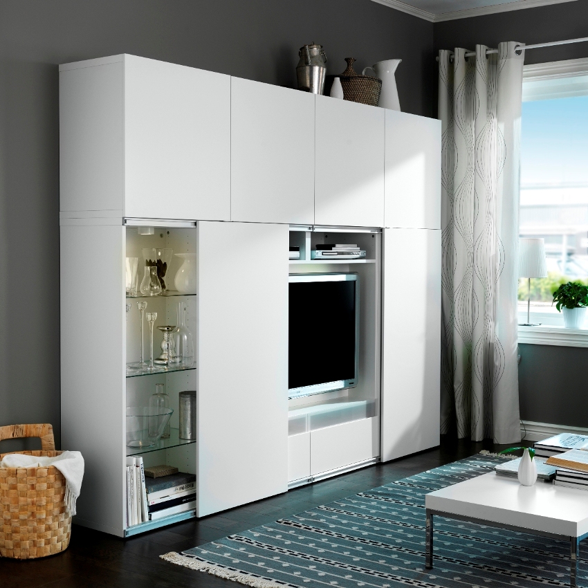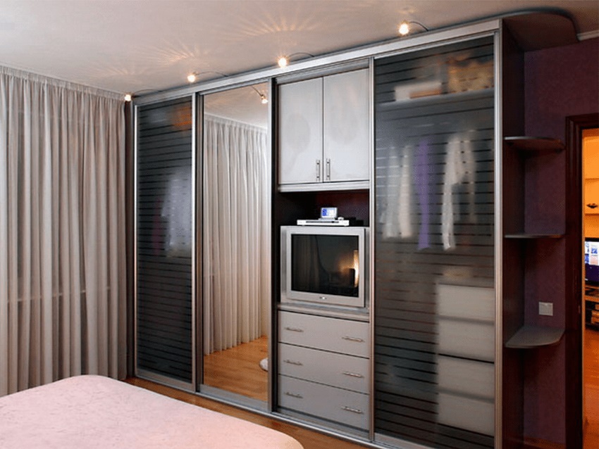 Corner mini-walls are very popular, especially if they are equipped with modern retractable and tilt fittings. Even with a small size of the product in the central part, you can place a TV, built-in minibar, a small chest of drawers for linen. Advantages of corner slides: