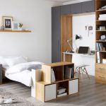 Modular systems are considered one of the most popular, because they make it possible to organize the space depending on personal needs. If standard furniture sets are installed only along one wall, then the modular set can be divided and elements can be placed where they will look most organic. In this case, you can improvise by dividing the room into different functional areas.