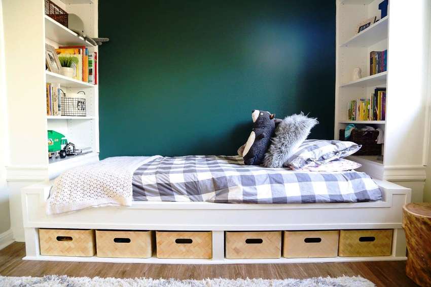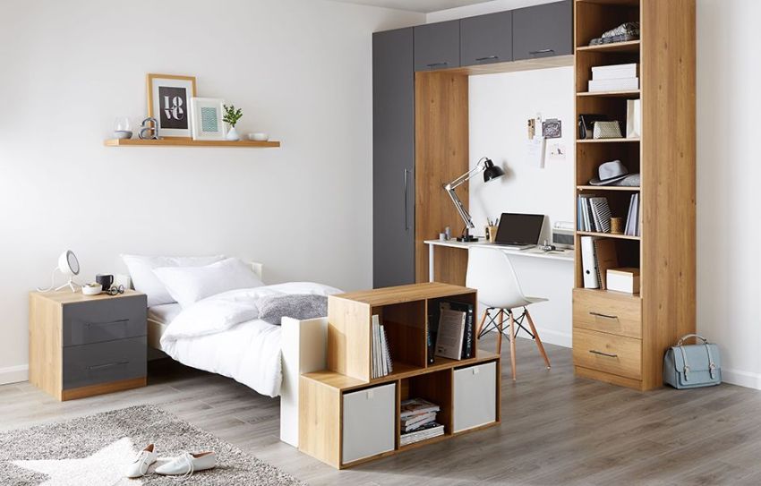 - Mini-walls. Installed in small or narrow bedrooms. They mainly consist of a shallow cabinet, a section for shelves and drawers. Depending on the selected design, the facades can be open or closed.