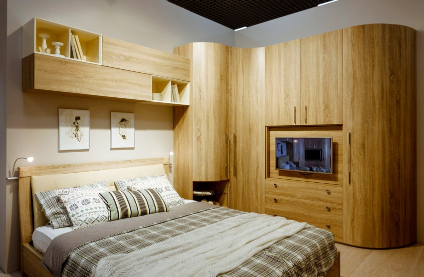 If you plan to install a corner wall under the TV, then you need to place it so that the TV is located opposite the bed, at a minimum angle, as a result of which it will be convenient to watch programs without getting up from your bed. The installation of a wall with a TV can also be thought out in a narrow bedroom. In this case, preference should be given to a shallow but wide structure.