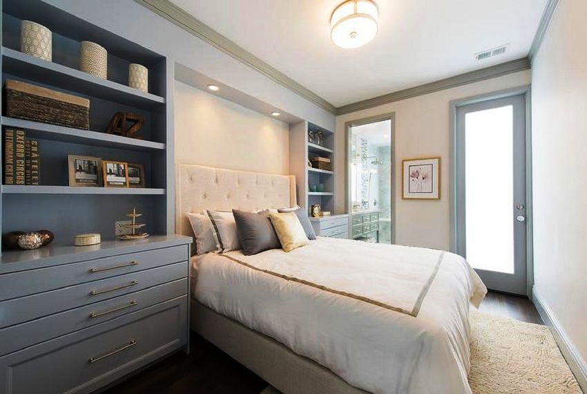 - the arrangement of elements of various heights creates the impression of free space, which is especially important in a small bedroom;