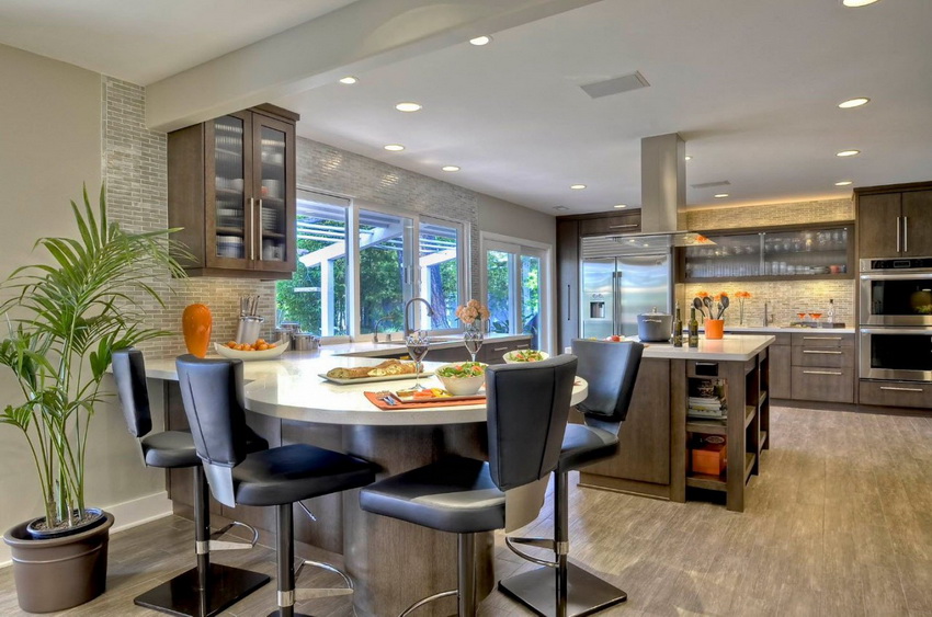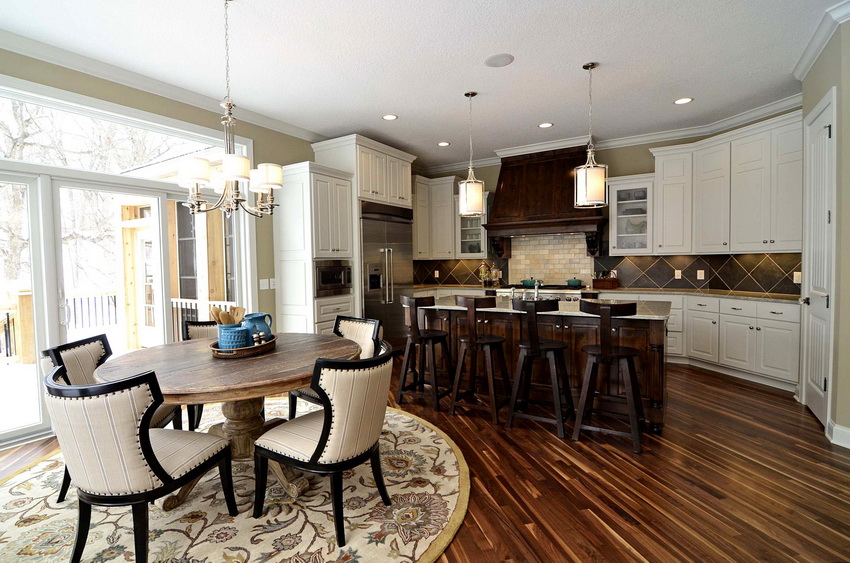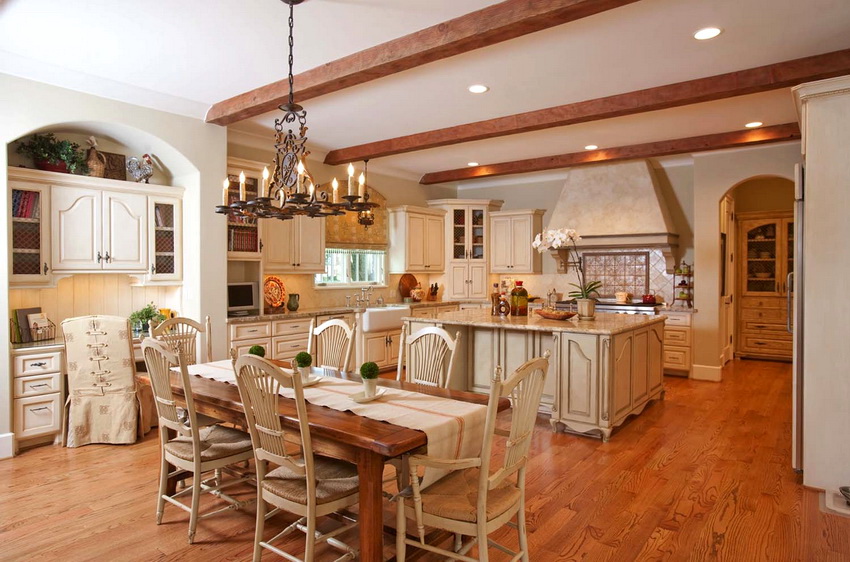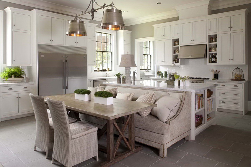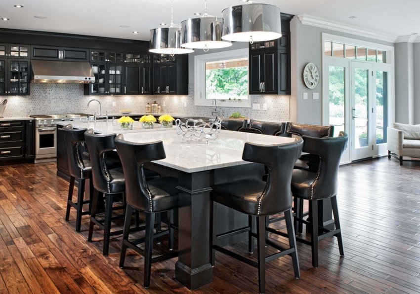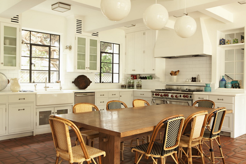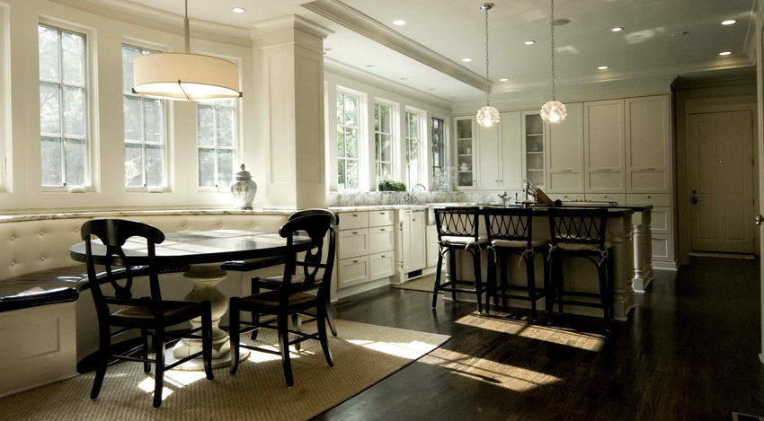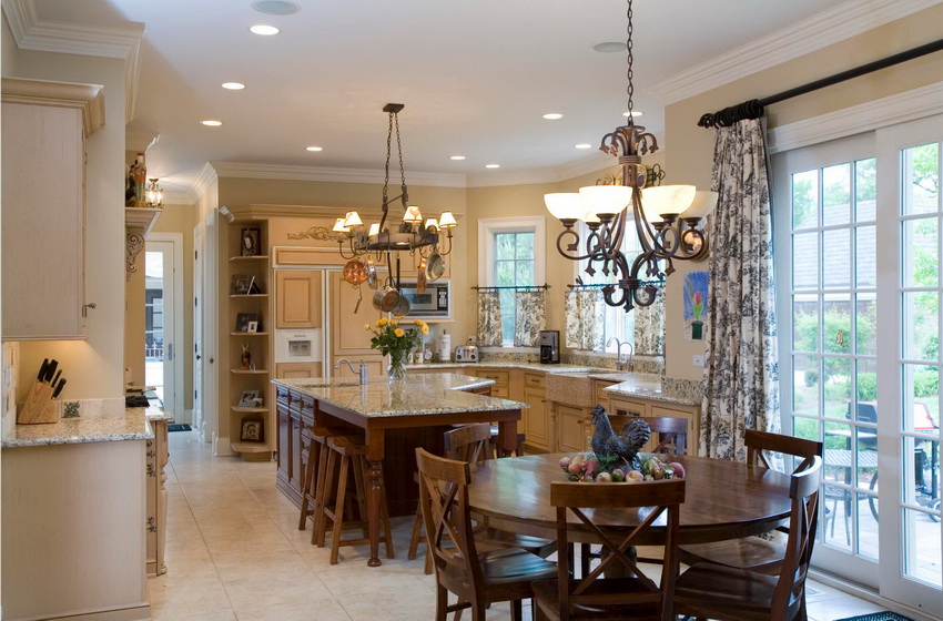 It is much easier to choose interior items for a spacious kitchen. The large area allows you to purchase almost any type of furniture, while paying due attention to style, design and comfort. Here you can give full free rein to imagination. Often for such kitchens, massive armchairs at a round table, special sofas or soft corners are used.
