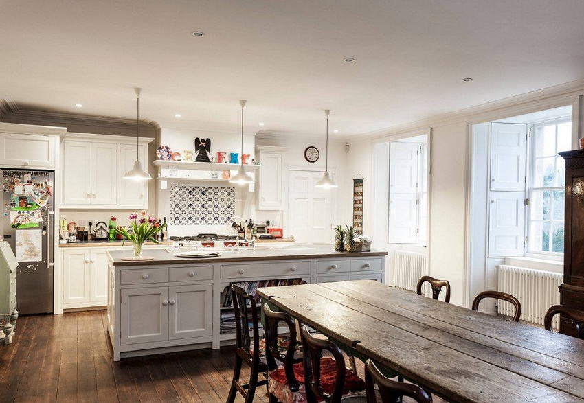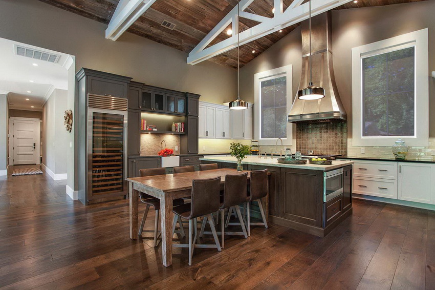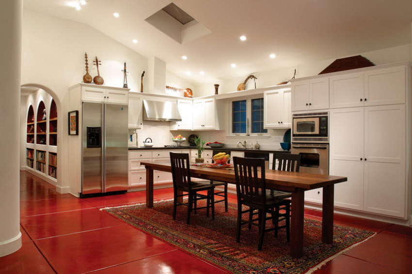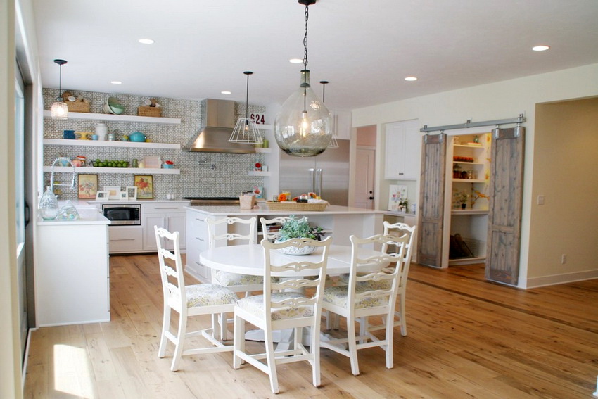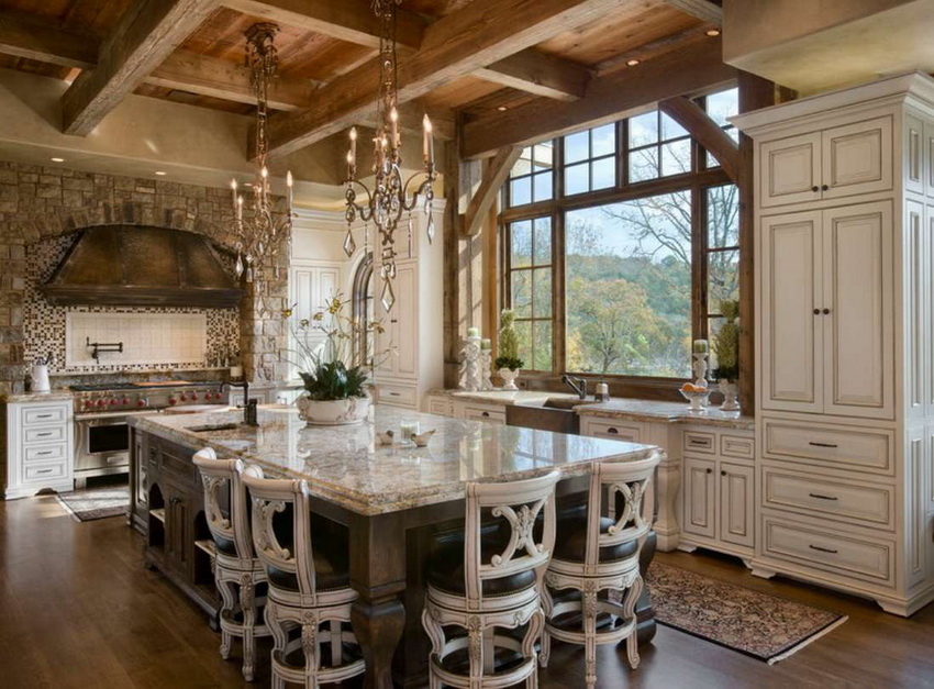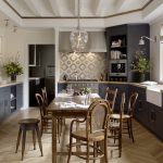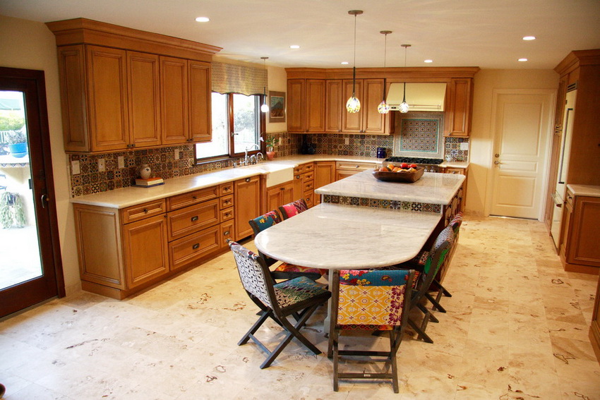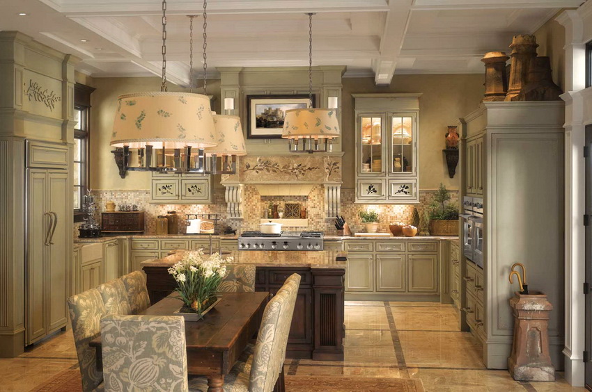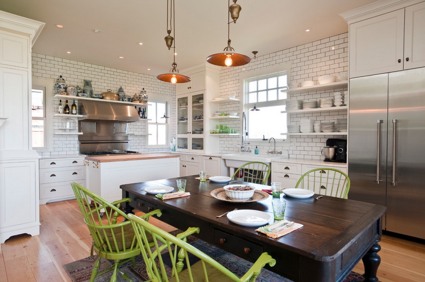 It is much easier to choose interior items for a spacious kitchen. The large area allows you to purchase almost any type of furniture, while paying due attention to style, design and comfort. Here you can give full free rein to imagination. Often for such kitchens, massive armchairs at a round table, special sofas or soft corners are used.