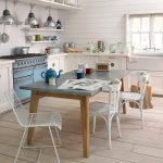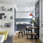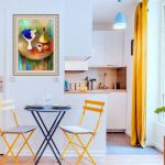 Kitchen chairs for a small kitchen should also be small. It is better to prefer models that move freely under the table; for this, the dimensions of the table top and seating are correlated. The optimal solution is a stool or a narrow chair with a seat width of no more than 35 cm.For a small family, it is enough to install a small round table or limit yourself to a small bar counter and a couple of chairs.