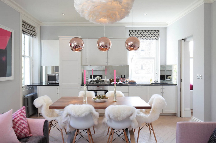- The combination of a table with chairs and other furniture in the kitchen, as well as harmony in design and compliance with the general style solution in the interior design.