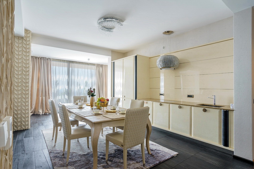 An important criterion is the selection of the appropriate size of interior items. It depends on how many people are supposed to be seated at the table. This factor must be taken into account first of all, because by reducing the area of the table, additional space will appear in the kitchen.You can correctly calculate the size using the following norms: 60 cm of the table length is necessary for each person plus the distance between the chairs - at least 25 cm.The minimum table width is 90 cm.A high-quality chair should withstand a load of up to 120 kg, it should not make a creak and sway when sitting on it.