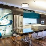 As an addition to glass tables and chairs for the kitchen, metal, plastic, wood are used. The surface can be glossy or matte, a great decoration - special drawings or photo printing. Most often, glass is used for the production of countertops. The main disadvantage of a transparent material is its fragility. In addition, the slightest dirt is visible on the glass surface.