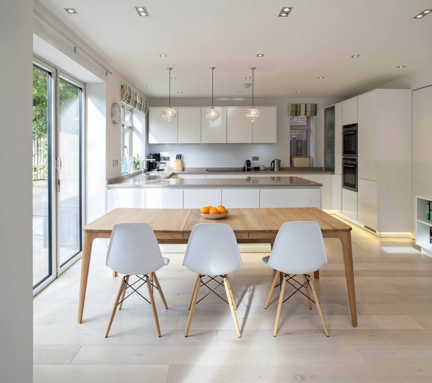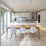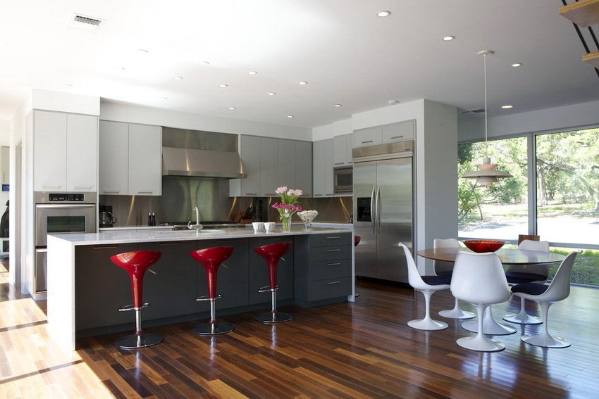 Lovers of bright colors should stop at such a style as modern. According to fashion trends, the color of the table and chairs is selected in accordance with one of the interior details, for example, to match the apron, countertop or facades. Beige and brown shades are typical for wood furniture. These colors are used in the design of various interiors, with the exception of high-tech style.
