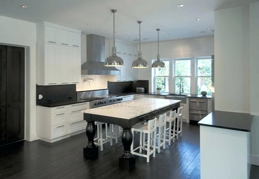 For large kitchens, the choice is much more varied. In a spacious room, a small table will look ridiculous. It is better to buy furniture sets that include a table and chairs of the appropriate color and shape. If items are purchased separately, then the main condition is a combination of form.