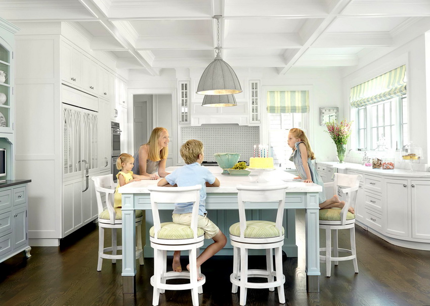 For a family with a small child, you should take into account the fact that up to the age of two years in the kitchen you will need a special stable high-legged highchair. This piece of furniture allows you to feed your baby at the same time as the general meal.