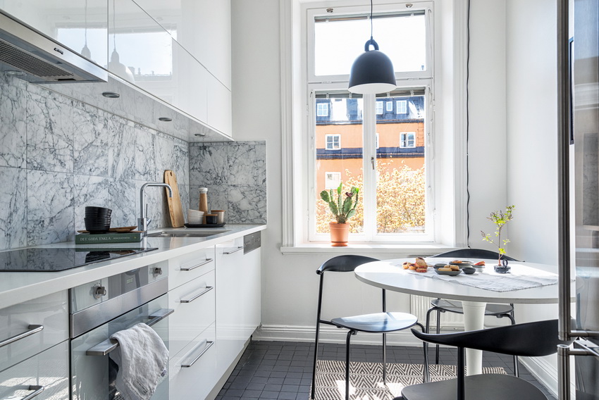 For a small kitchen, a small rectangular or square table would be an excellent solution. If you plan to receive frequent guests in a small area, then it is better to give preference to folding or sliding models. In this case, it is imperative to assume the possibility of placing the table in a folded and extended state.