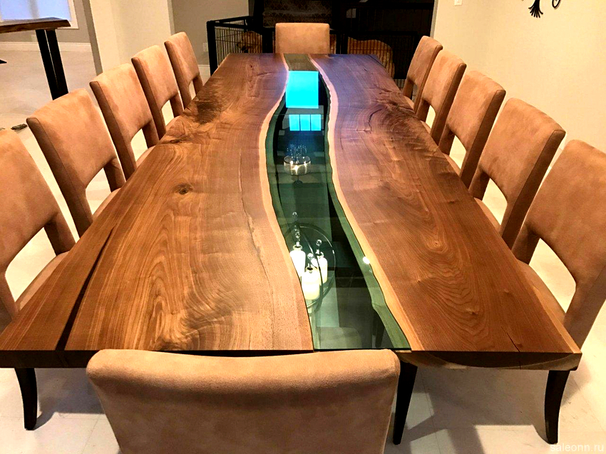 The table with epoxy resin is a bright and expressive element. The more original its design, the more thoughtful the interior of the room should be. For a classic style, rectangular or oval baseboards framed with epoxy are suitable. It is better to apply the color brown, possibly to match the wood.
