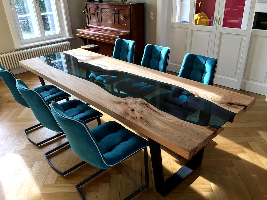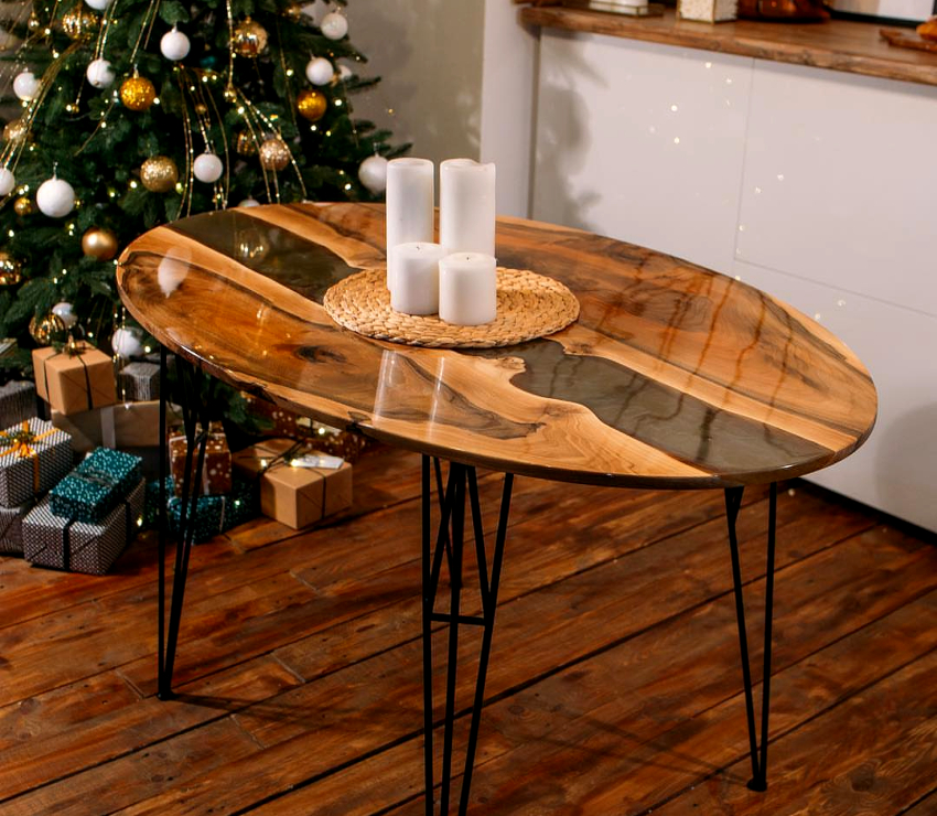 Epoxy tables are often used in living rooms because their glossy surface contributes to a festive atmosphere.