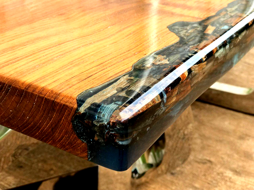 The presence of cracks, voids from knots, irregularities form the basis of the decor. Epoxy fills in cavities, leveling the surface, giving an unusual and aesthetic appearance to the product. The toning of the mixture used provides additional opportunities for creating an original decor.