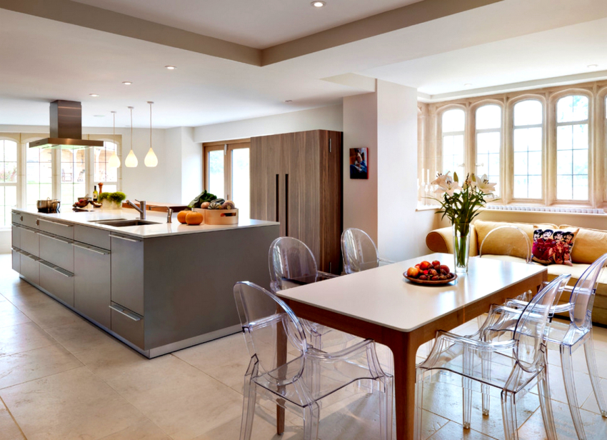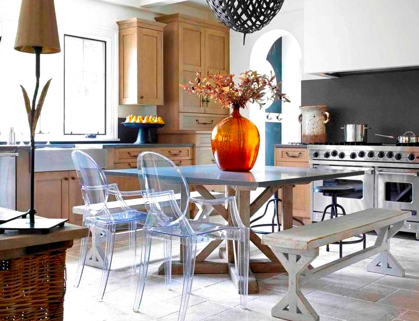 Modern designer furniture is quite expensive. You can add uniqueness to your kitchen interior with inexpensive transparent chairs. Kavjari and other popular manufacturers produce products that are not very expensive, but they look stylish and laconic, which allows them to fit into almost any interior.