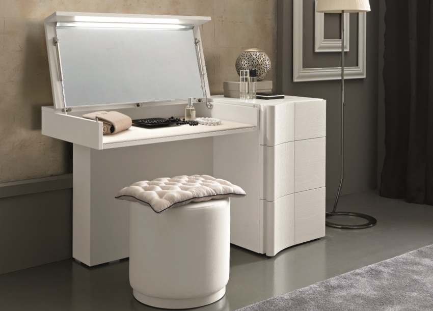 It is interesting! Nowadays, you can find many original dressing table options in stores that have different functions. For example, models are very popular in which the table top is retracted or, if necessary, the mirror is hidden. All of this is very convenient and also saves precious indoor space. In this regard, bulky chests of drawers and cabinets are being forced out of the sleeping rooms.