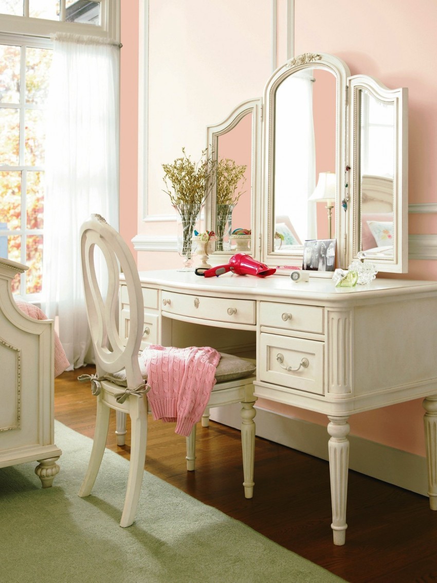 For a girl of six or seven years old, you can already buy a product with real mirrors, since at this age you already want to not only play, but also try on various outfits. For a fashionista of 12-14 years old, models with a wooden bedside table made in Provence or Baroque style are suitable. For teenage girls, you can already purchase a trellis with a mirror. In the bedroom, such a model will look very beautiful.