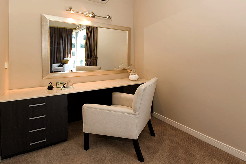 Usually, dressing tables are purchased for installation in the bedroom. Most often, this piece of furniture, along with a bed and a wardrobe, is included in the bedroom set. In this case, it can be placed near a wardrobe or chest of drawers. If the bedroom is small, then you can place the dressing table in the hallway or bathroom.