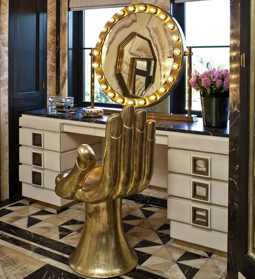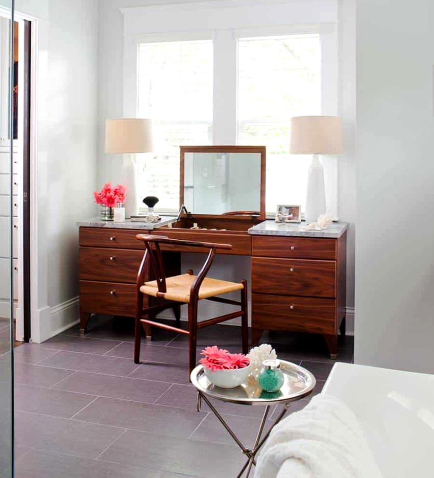 The final role in creating a harmonious interior with a dressing table is played by the selection of accessories and a seat for it. The design, complemented by sophisticated fittings, looks very aesthetically pleasing and beautiful. For their manufacture, you need to use high-quality material that is able to withstand the effects of external factors, for example, moisture. Well-chosen fittings do not create noise when opening drawers.