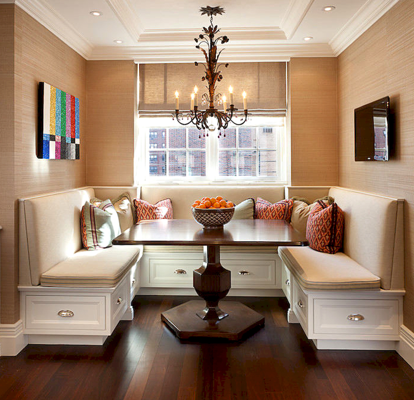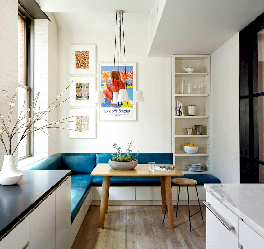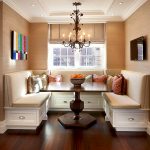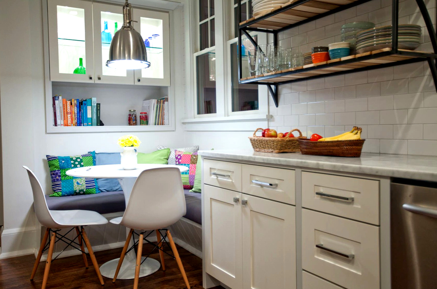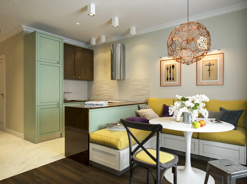 In larger rooms, free space may remain near the dining area. In such cases, you should think about buying a kitchen corner folding sofa, which, when opened, turns into a full-fledged place to sleep. This benefit will come in handy for families with small children.