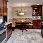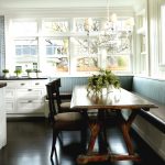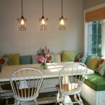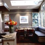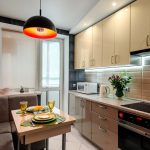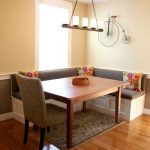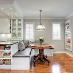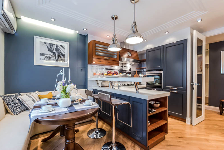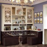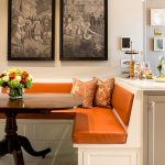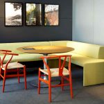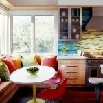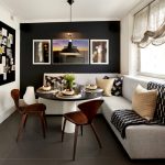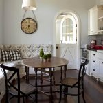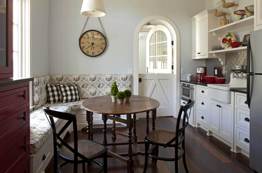 The most common option for installing a sofa is along a wall with a headset. This technique is usually used if the kitchen area is rather long. As a rule, in this case, there is free space behind the headset, which can be used to equip the dining area. In long but narrow rooms, the optimal solution would be to purchase a corner sofa, which is part of the kitchen furniture, its continuation. This composition will perfectly complement a small round table.