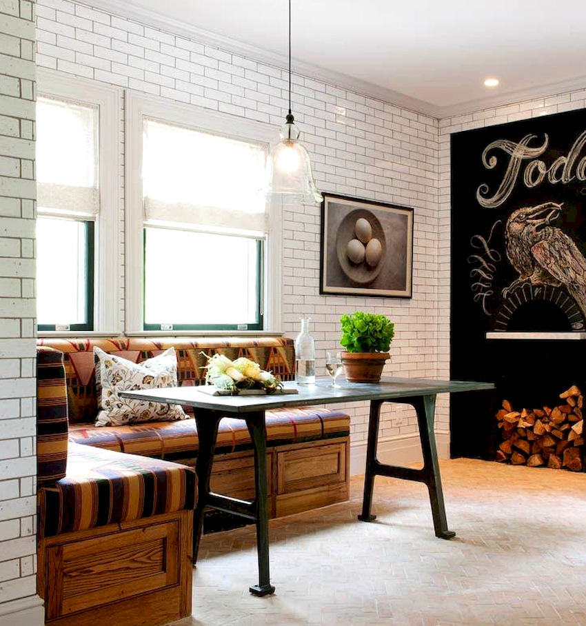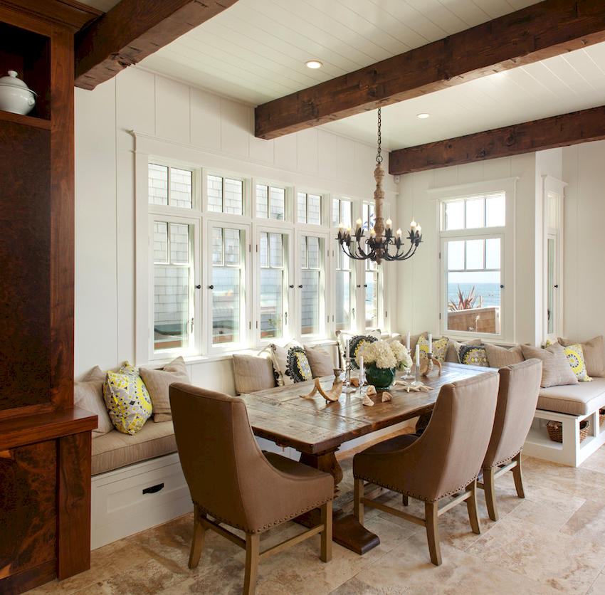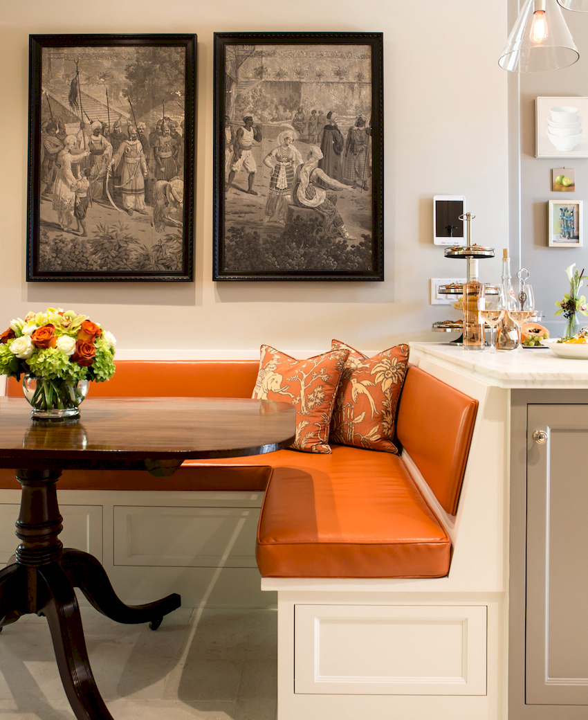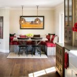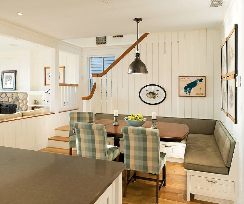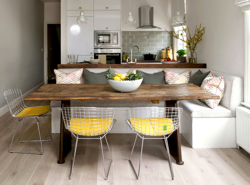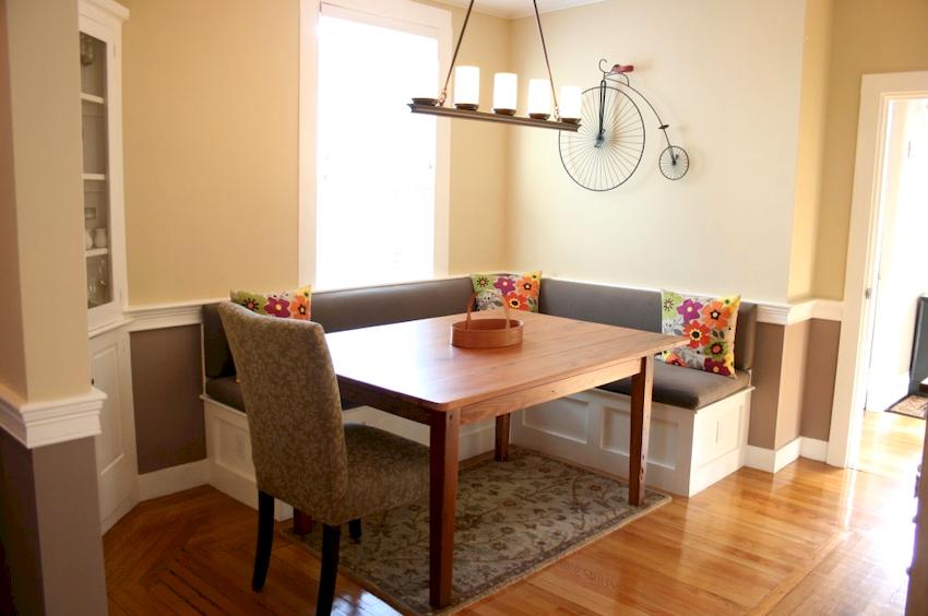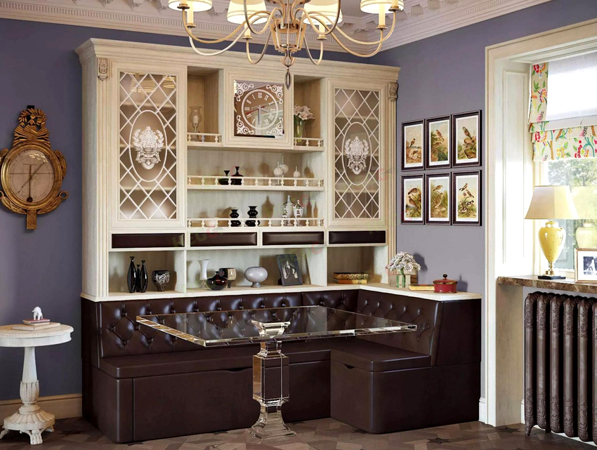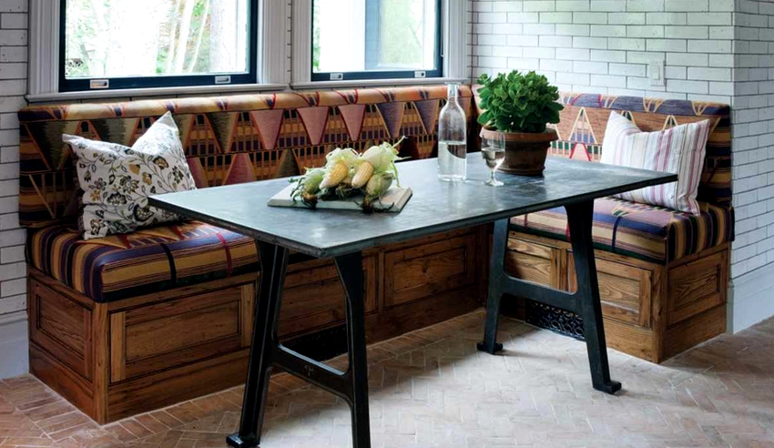 If the interior of the room is made in a vintage style, it is recommended to use a sofa bench to organize the dining area. In these designs, the body is made of solid wood and the seat is formed from soft cushions.